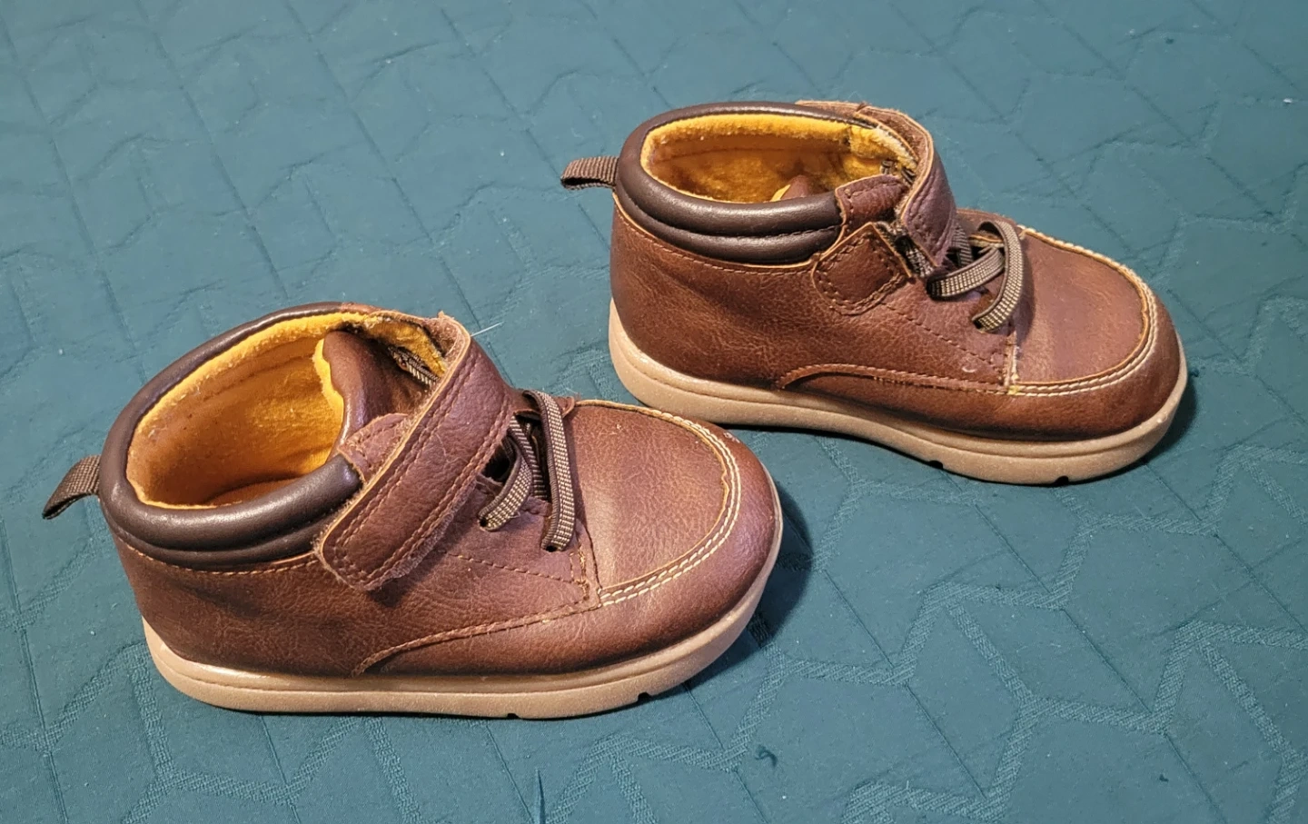 Carter's toddler boots in a rich brown colour. These boots feature a hook-and-loop strap and laces for a secure fit. They're made with a synthetic upper and a rubber sole.