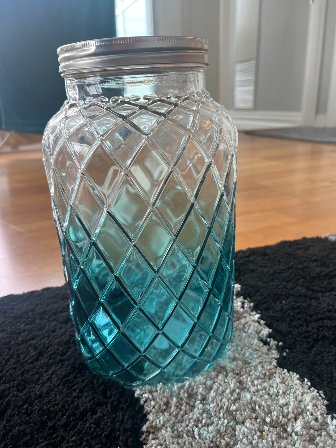 Almost new ( used only once for water )This glass beverage dispenser has a diamond pattern and a blue gradient. It comes with a metal spigot for easy serving. Great for parties or gatherings!