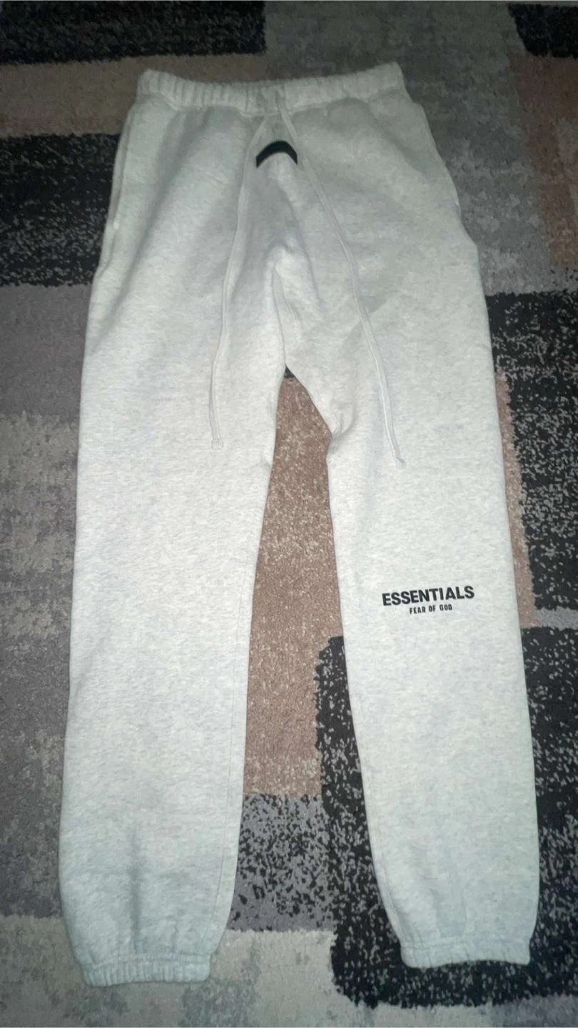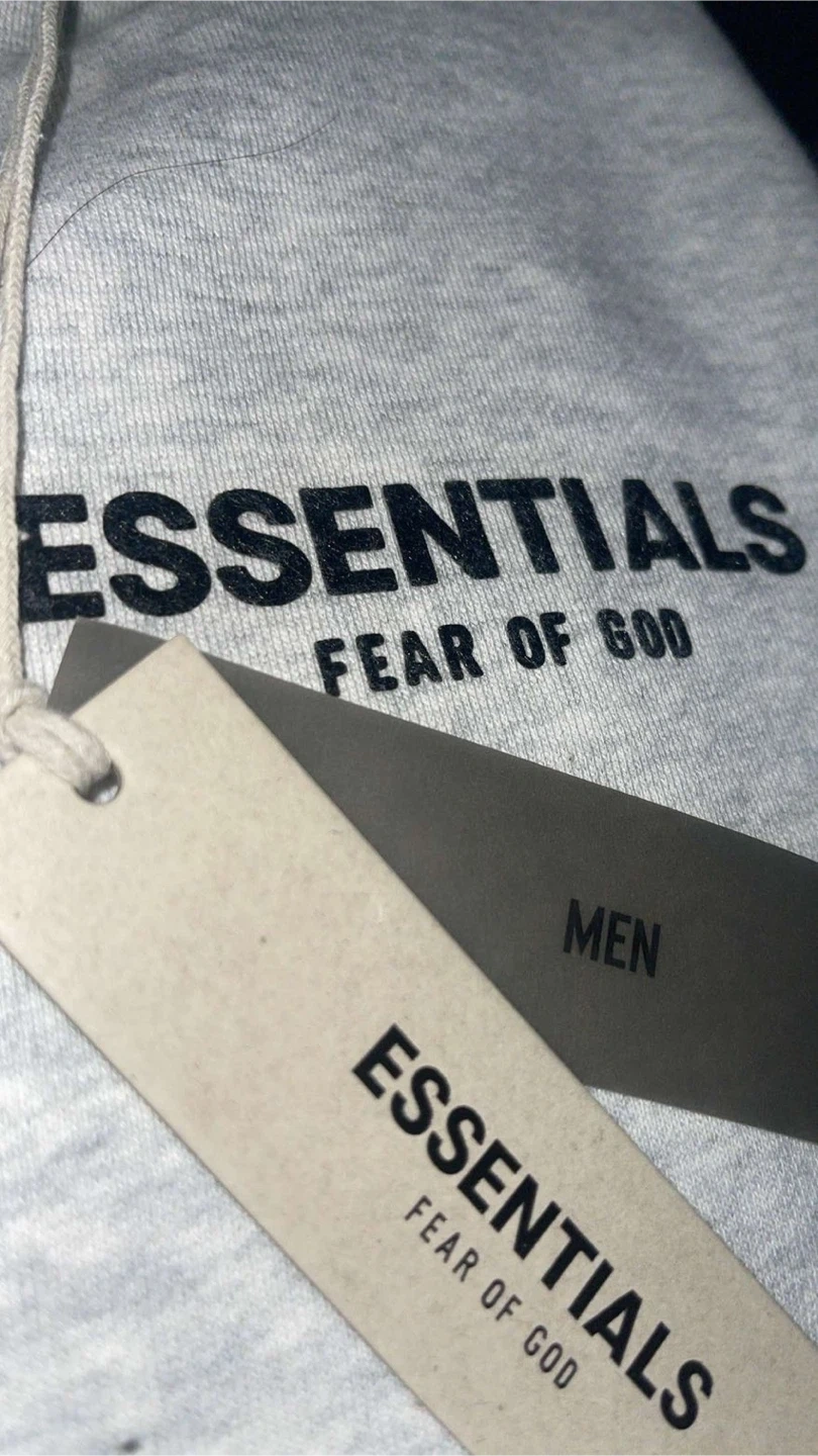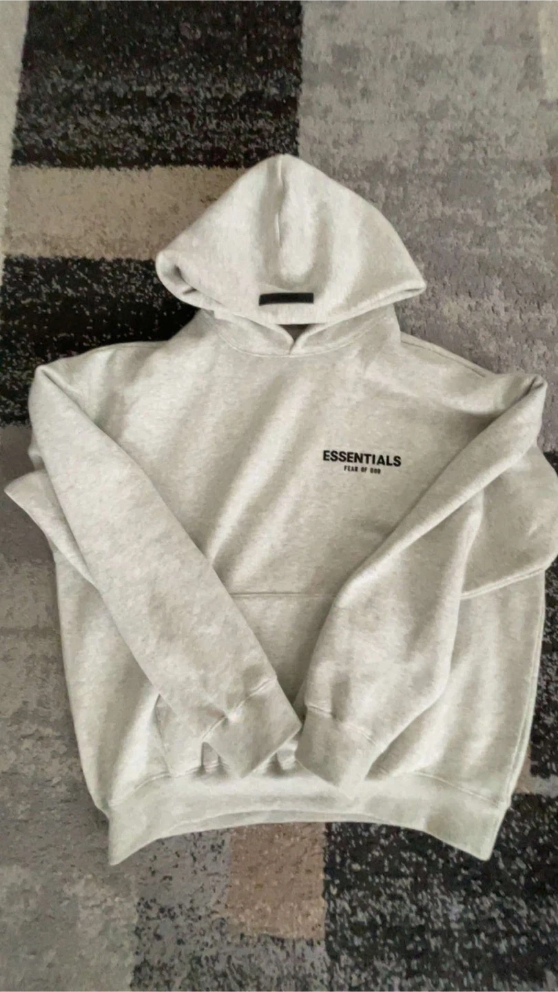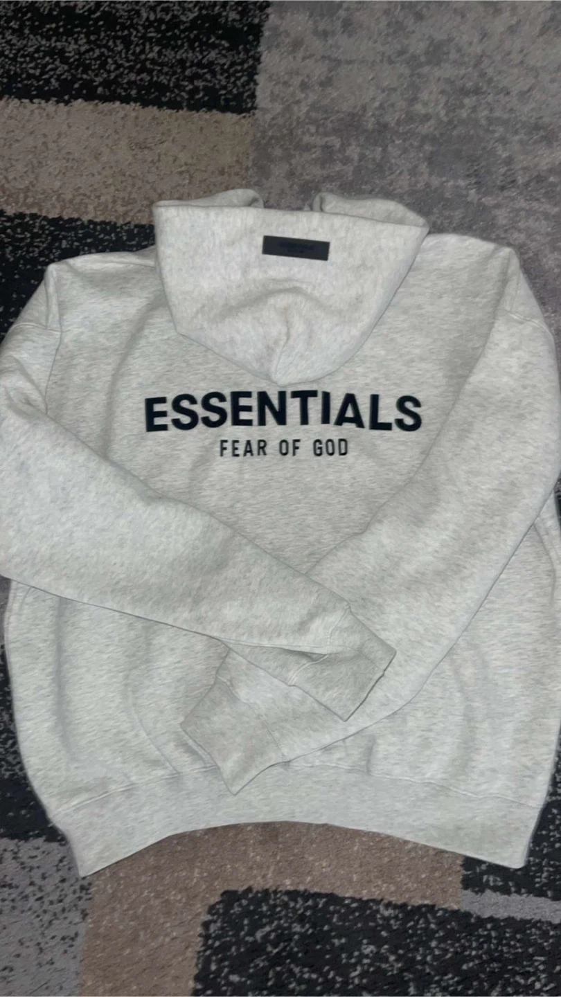 This is a matching set from Fear of God Essentials, including a hoodie and sweatpants. Both pieces are a light grey heathered colour and made from a comfortable fleece material. Perfect for casual wear, these pieces offer a relaxed fit and the brand's signature minimalist style. BRAND NEW SIZE SMALL TO MEDIUM DM FOR AUESTIONS ONLY IF SRS
