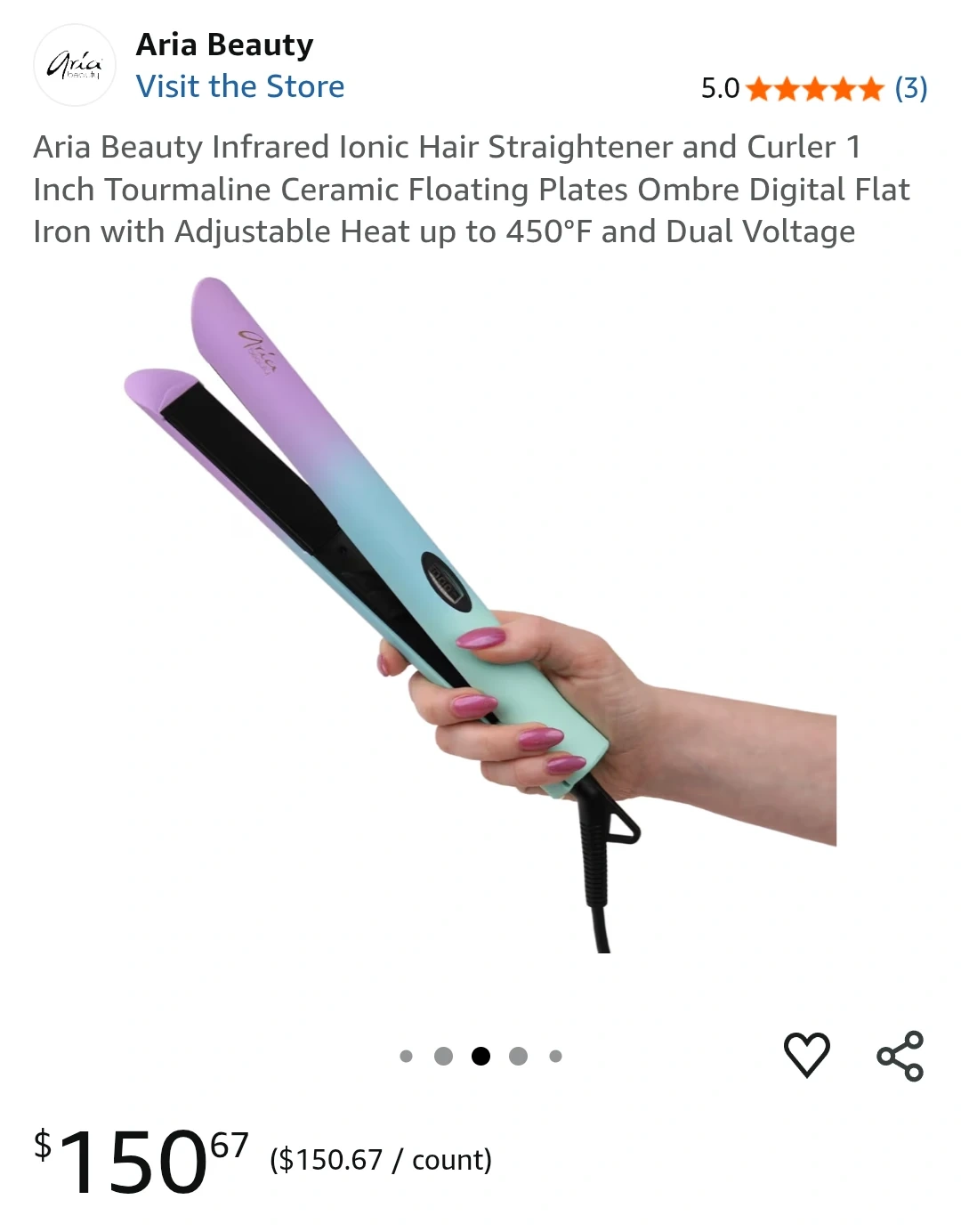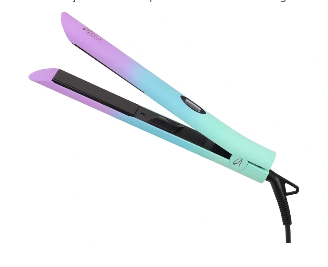 Aria Beauty 1" digital hair straightener in an ombre design. Features tourmaline ceramic floating plates with adjustable heat up to 450°F. It has dual voltage.