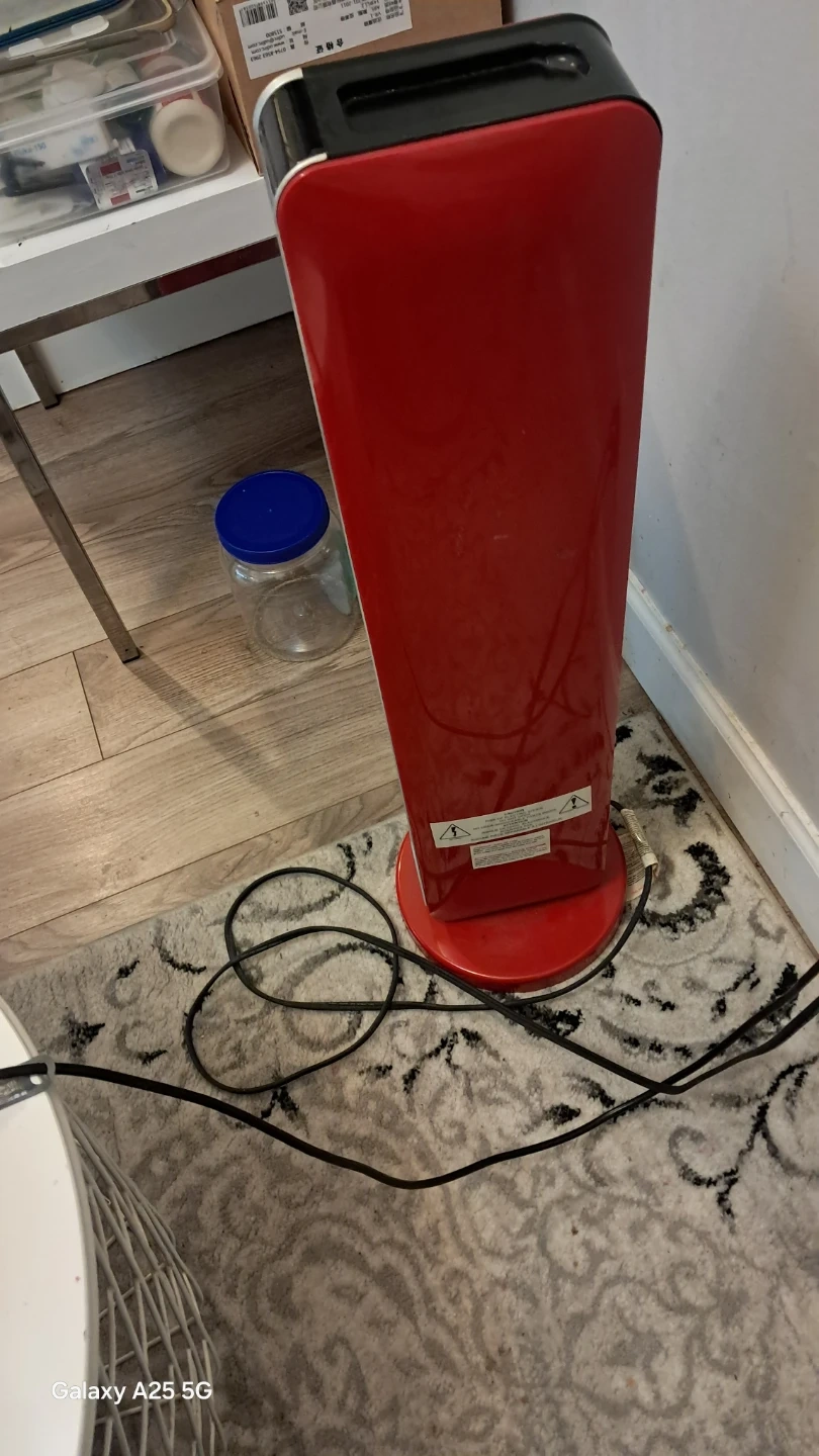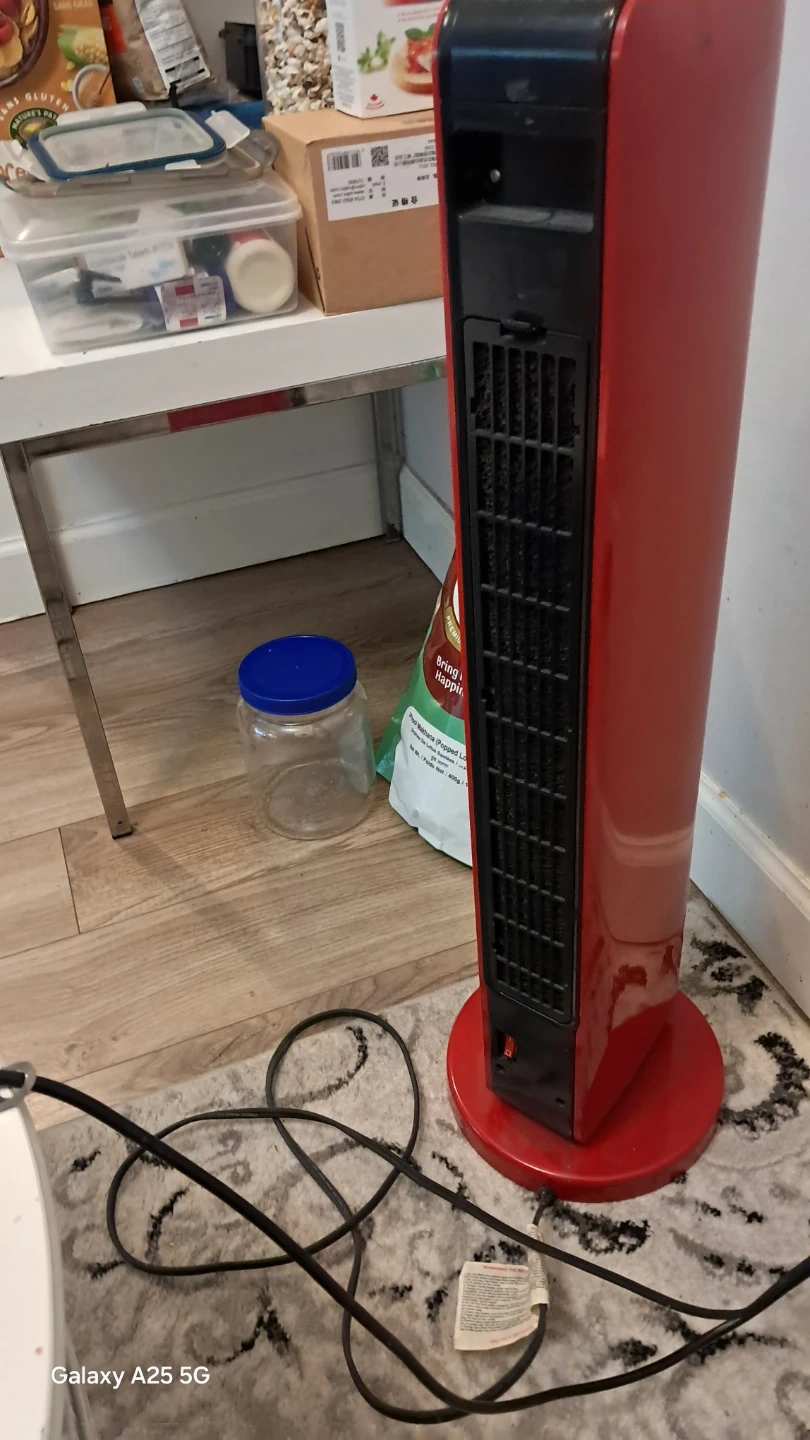 This Noma tower fan heater is red and has a digital display. It's great for heating up a room quickly. Measures approximately 28" tall. I am moving to home country delivery also available a little bit charges depends upon distance