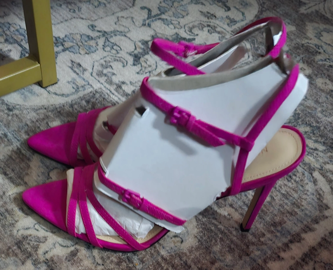 Gorgeous pink high heels, featuring straps and buckles. Pointed toe style. Perfect for a night out dancing or a special event, these shoes are a fun way to add a pop of colour to any outfit.