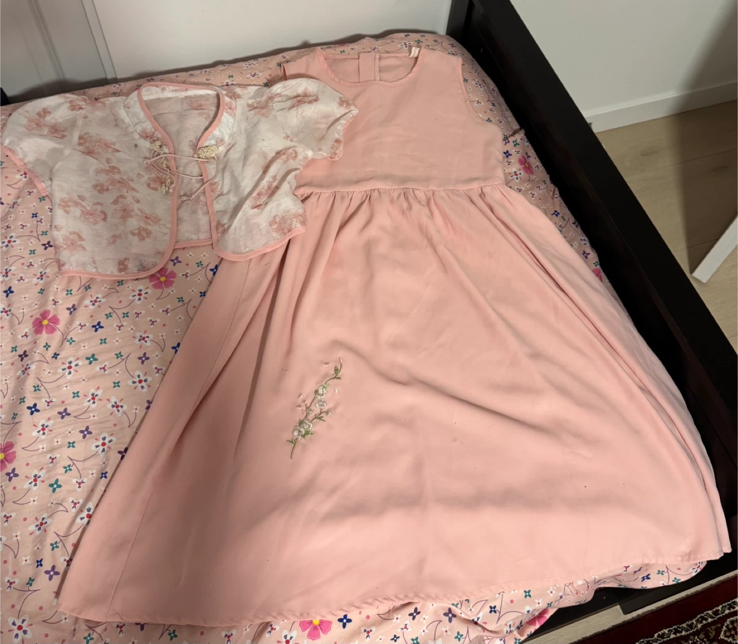 A pretty pink dress paired with a coordinating short-sleeved bolero jacket. The dress features a delicate floral embroidery detail near the hem. The bolero has a classic frog button closure. It's perfect for special occasions or a lovely outfit for parties.