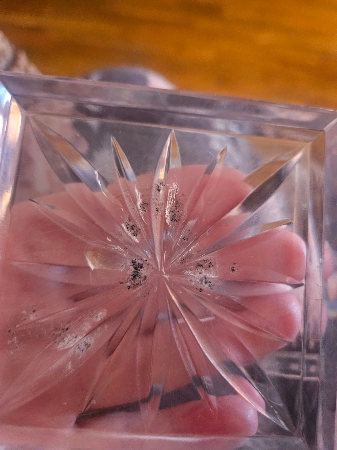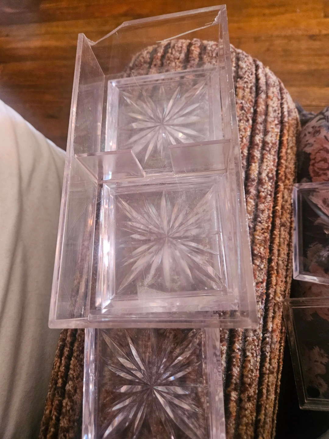 8 Acrylic Lucite coasters featuring a starburst etched design. Coasters are square shaped Dec-O Genuine Duracile Starburst w/ case,Some minor dust and scuffing visible on surfaces. They're a classic addition to any table setting!