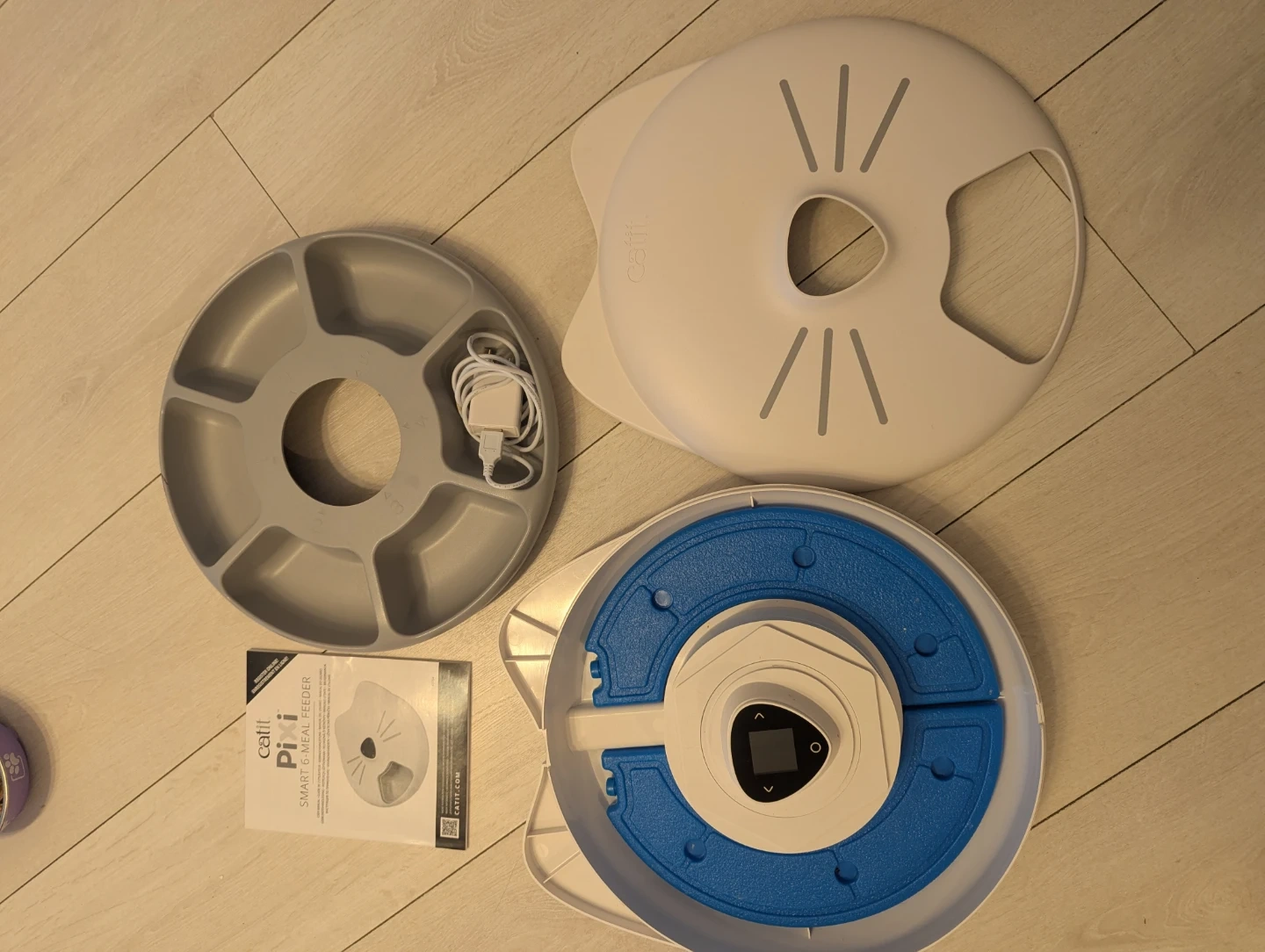 This Catit Pi smart food feeder has six meals to help keep your pet fed. It comes with the unit, tray, lid, and USB charger. It's a great way to portion out food for your cat or small dog!