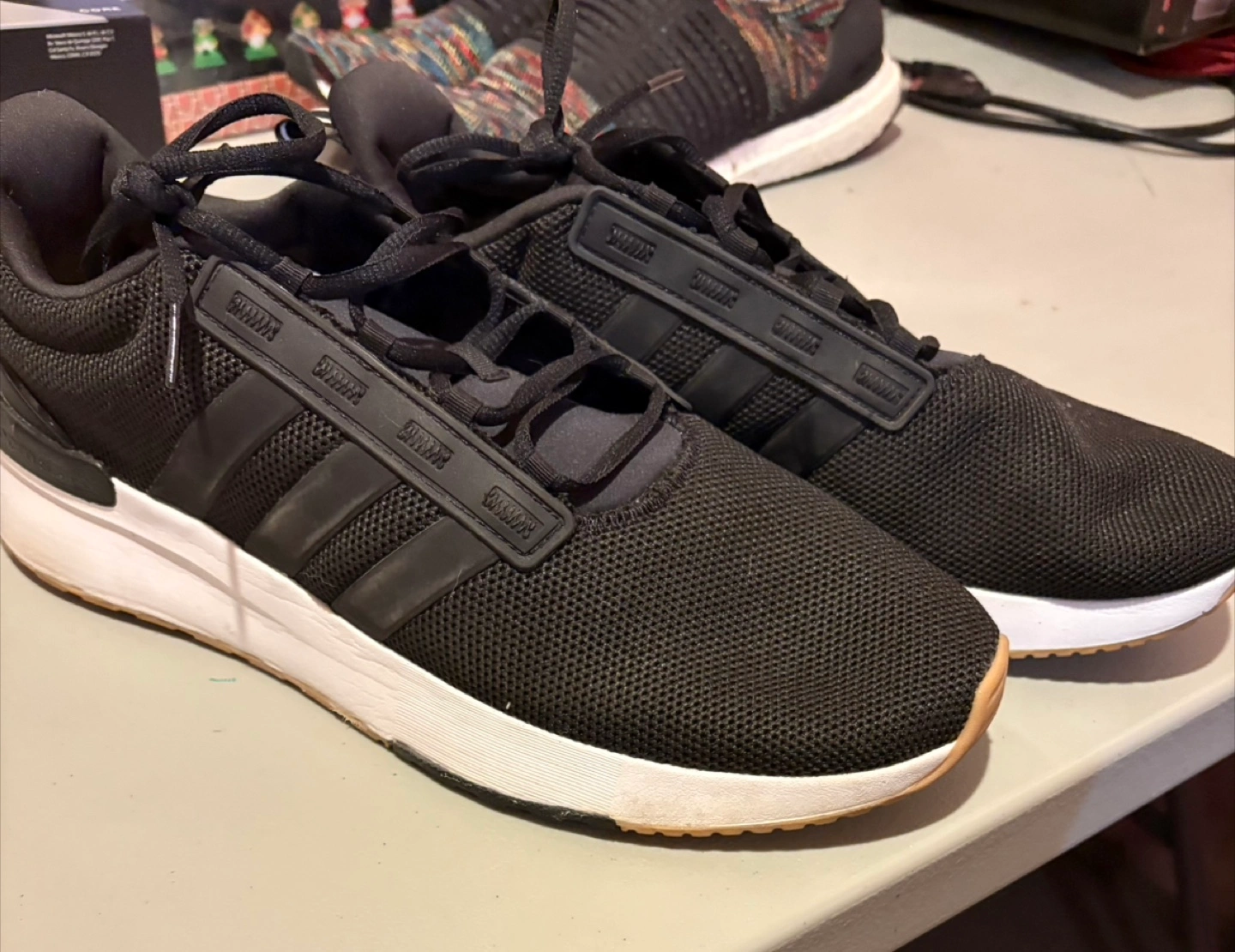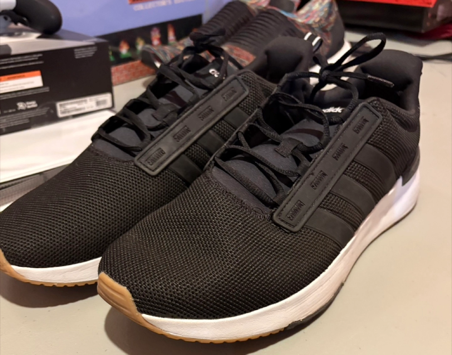Black sneakers with white soles. Adidas stripes are visible on the sides. The front of the shoe has a brown accent. They are laced up. These shoes are great for a comfortable walk. Shoes were worn once