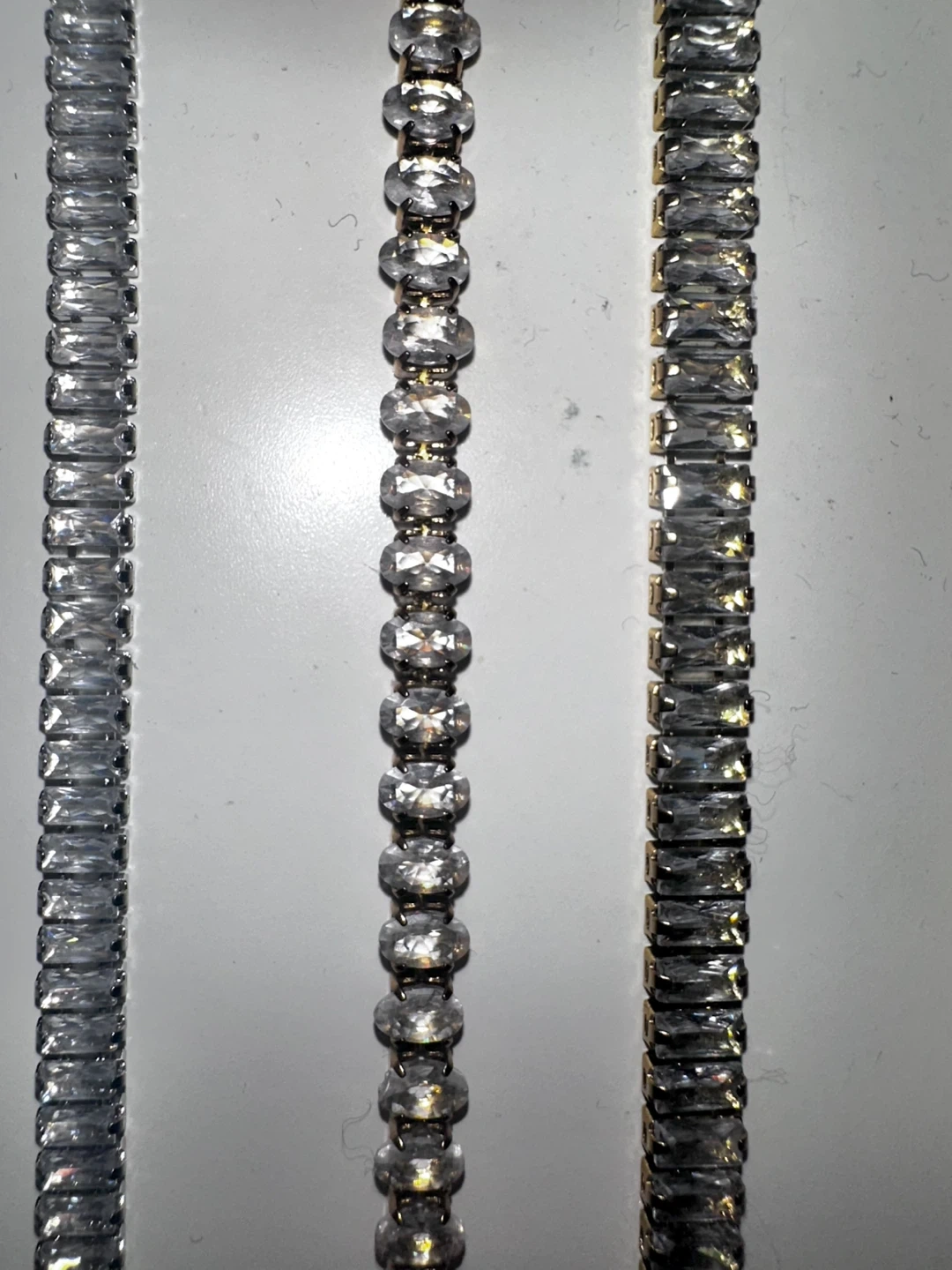 Three sparkly tennis bracelets from EVRY JEWELS. Features two baguette-cut styles and one round-cut style. Includes a pink pouch for storage.