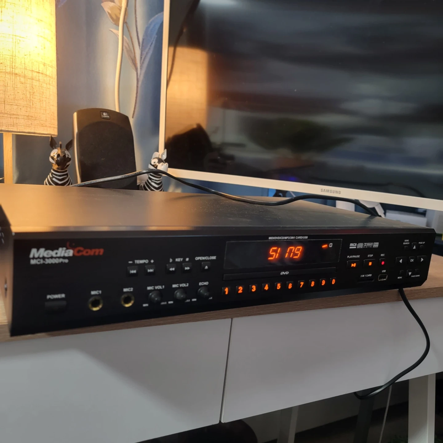 This MediaCom MCI-3000 karaoke machine plays DVDs and CDs. It has USB and 3-in-1 card slots for media playback. Supports MIDI and Dolby Digital formats.