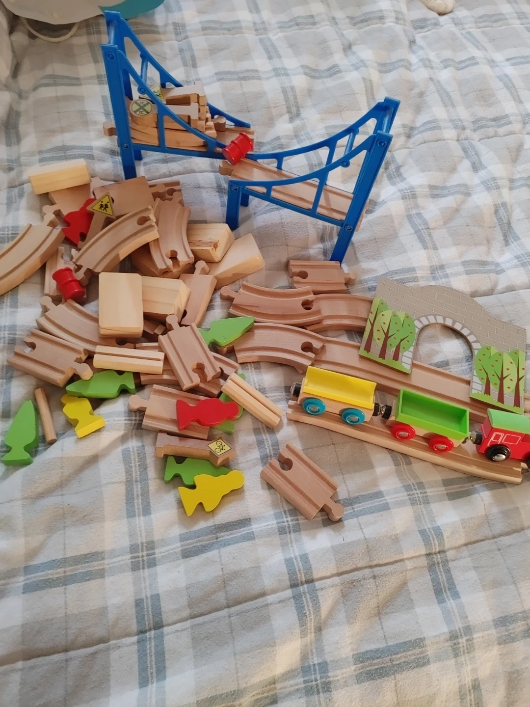 A fun wooden train track set with lots of pieces, including curved and straight tracks, a bridge, and small train cars. It's got trees, signs, and little red barrels too. Great for imaginative play!