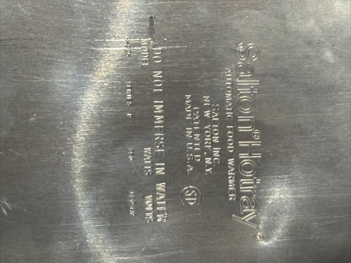 Vintage Salton Hotray food warmer. Brown wooden frame. Excellent for keeping food warm. Includes power cord. Made in the USA.
