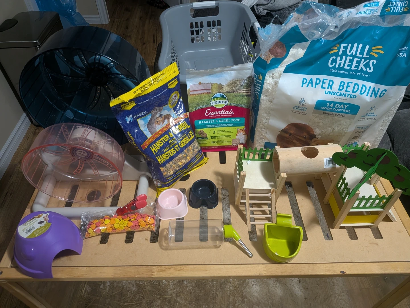 This bundle includes a wooden and plexiglass hamster cage, a large and medium exercise wheel, food, and bedding. It also comes with multiple food dishes, water bottle, and various toys and hideouts for your small pet. Everything you need to set up a comfortable habitat for your hamster or gerbil! $200 obo bedding inside is fresh can be cleaned out if wanted or left in