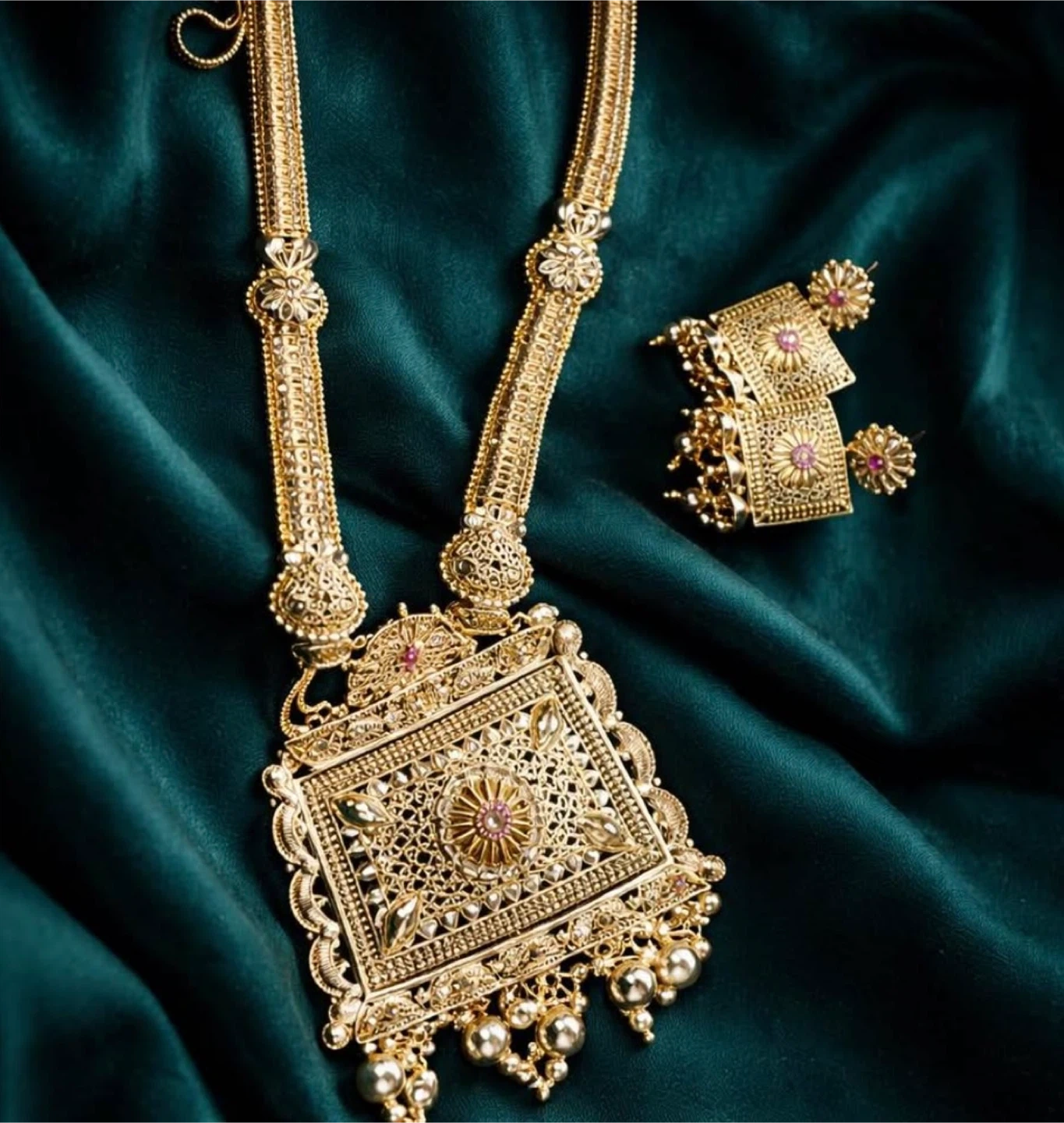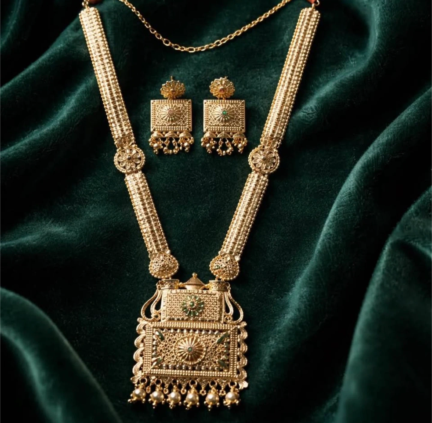 This beautiful gold tone necklace and matching earrings set features intricate detailing. The necklace has a long chain with a large decorative pendant. Earrings are a square stud style with dangling accents. A stunning addition to any jewelry collection!