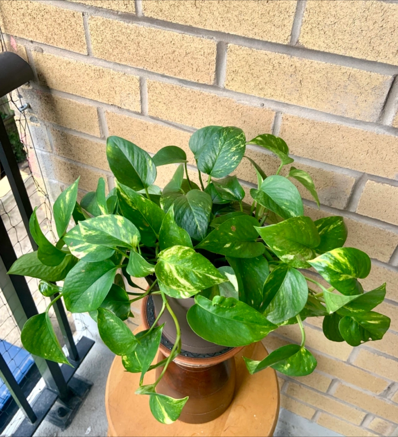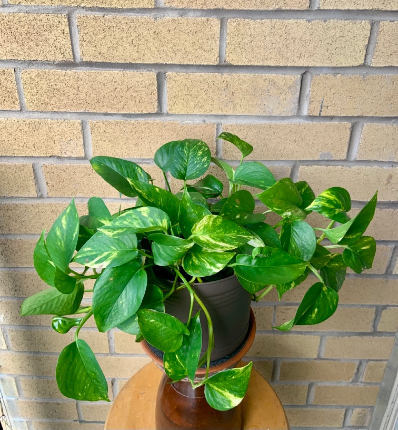 Healthy, well-established Marble Queen Pothos. Lots of vibrant leaves. Planted in a light green pot. Ready for a new home.