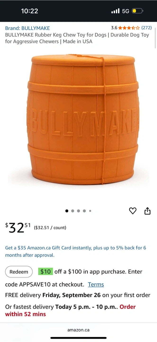 I can do the same as amazon but you need to buy 100 dollars worth of toys so 5 toys in total and the 6th toy will be 10 dollars it will stay that way until I have less then 6 then its 20 per toy as usual BULLYMAKE rubber keg chew toy for dogs. Durable rubber construction. Made in USA. This toy is great for aggressive chewers!