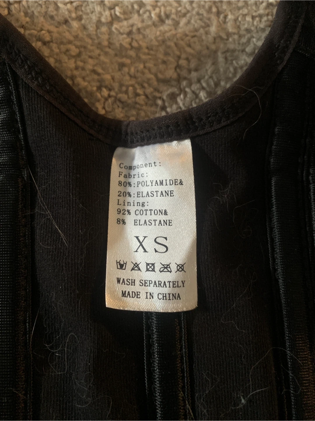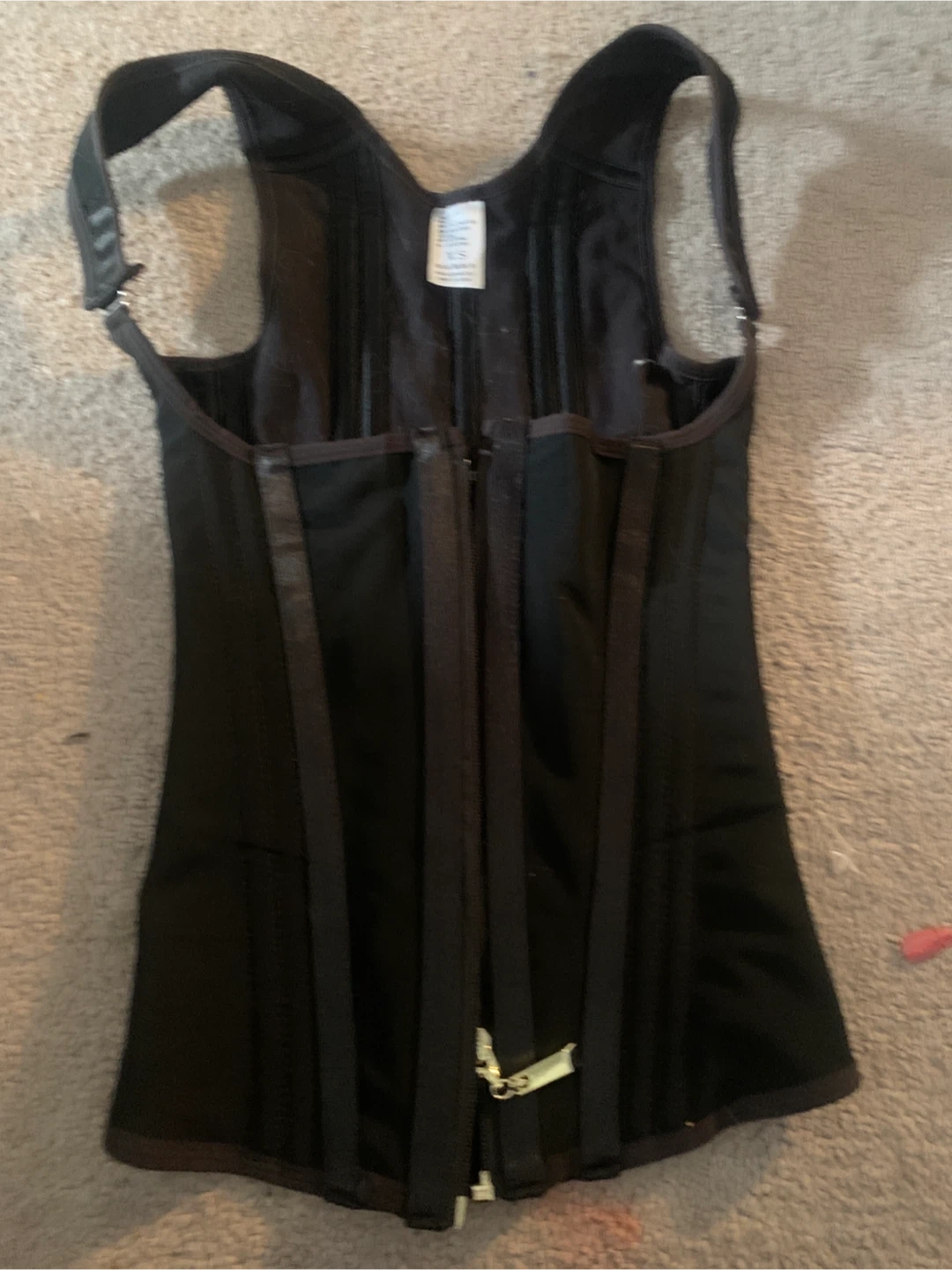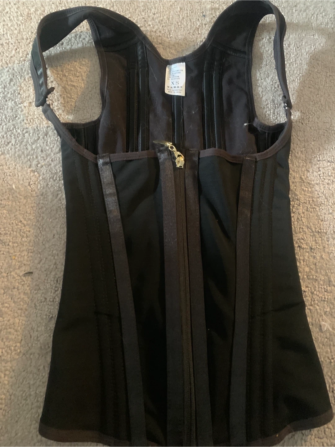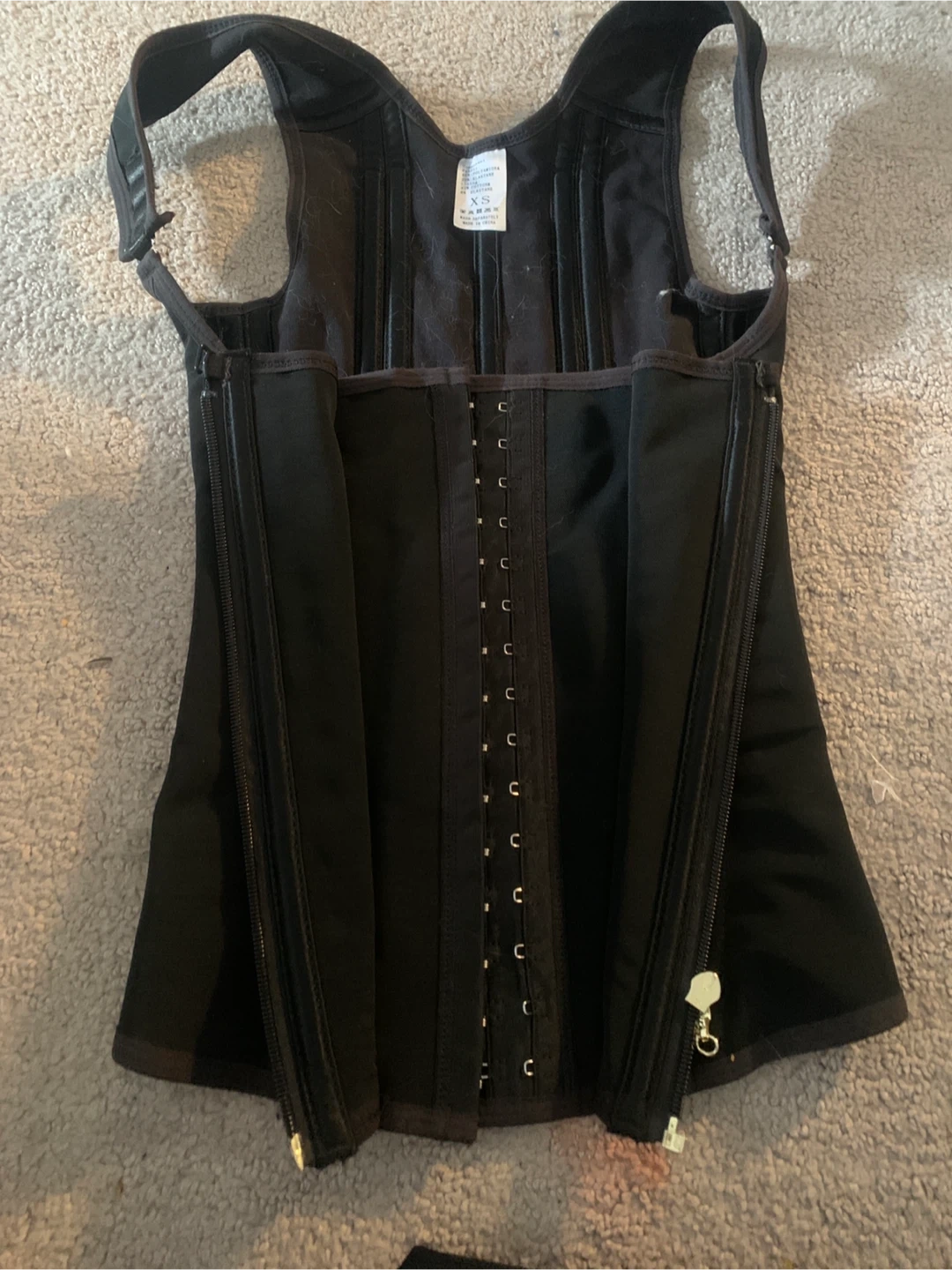 This black corset waist cincher is made with a fabric of 80% polyamide and 20% elastane. The lining is 92% cotton and 8% elastane. It's a size XS with hook and eye closures and zippers. It provides firm shaping.