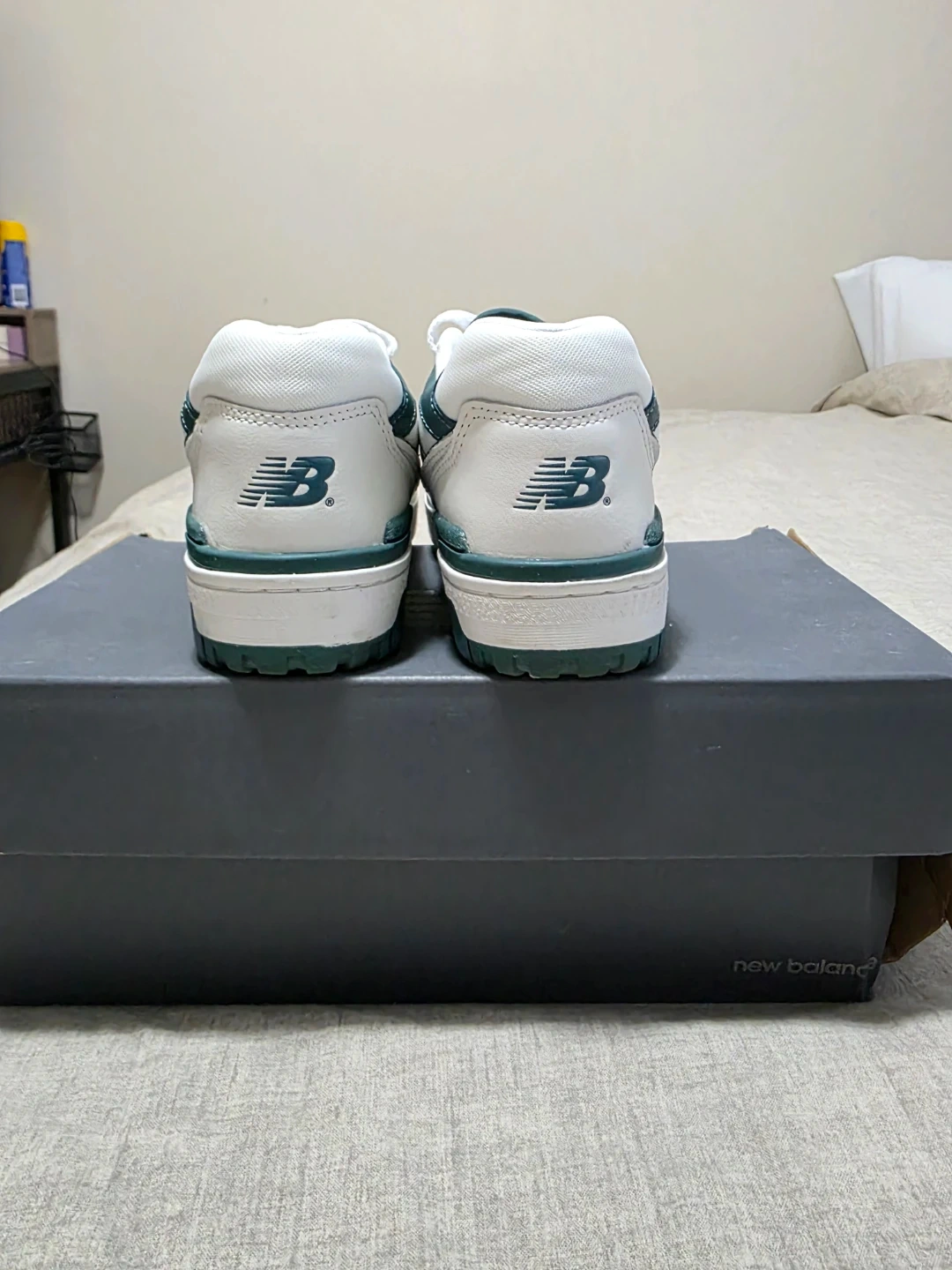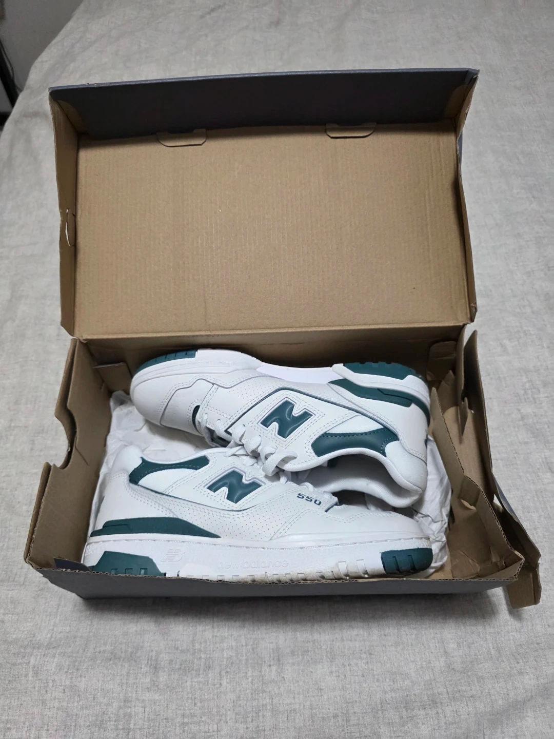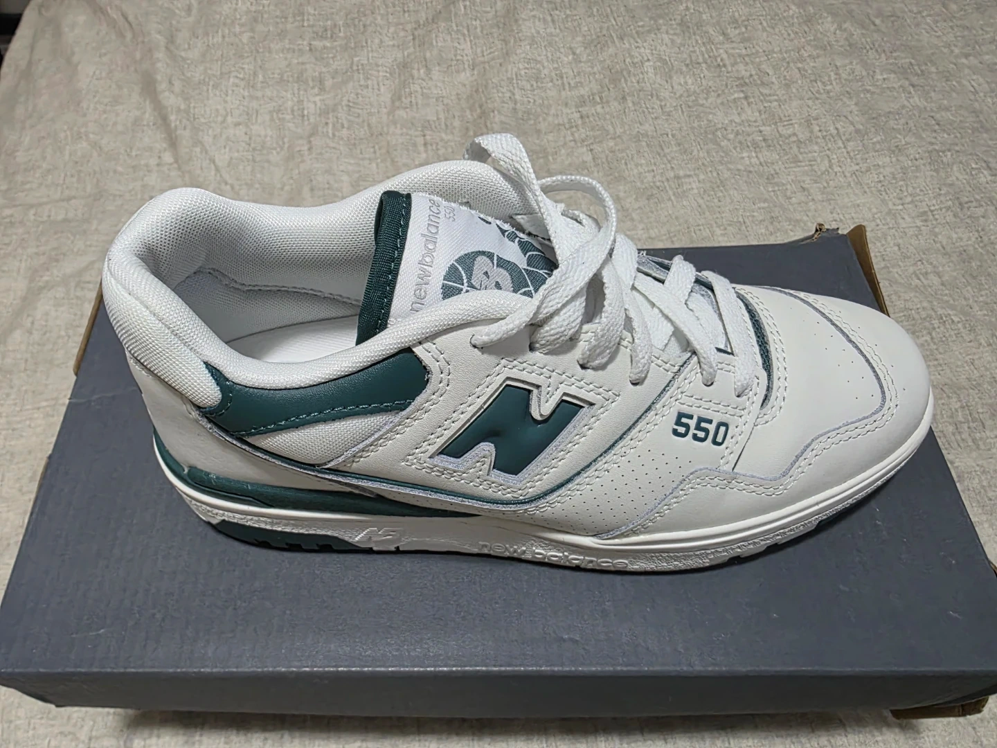 Womens Classic New Balance 550 sneakers in white with forest green accents. These low-top shoes feature a leather and synthetic upper with perforations. They come in their original box. It's a great shoe for everyday wear! Purchased for $150