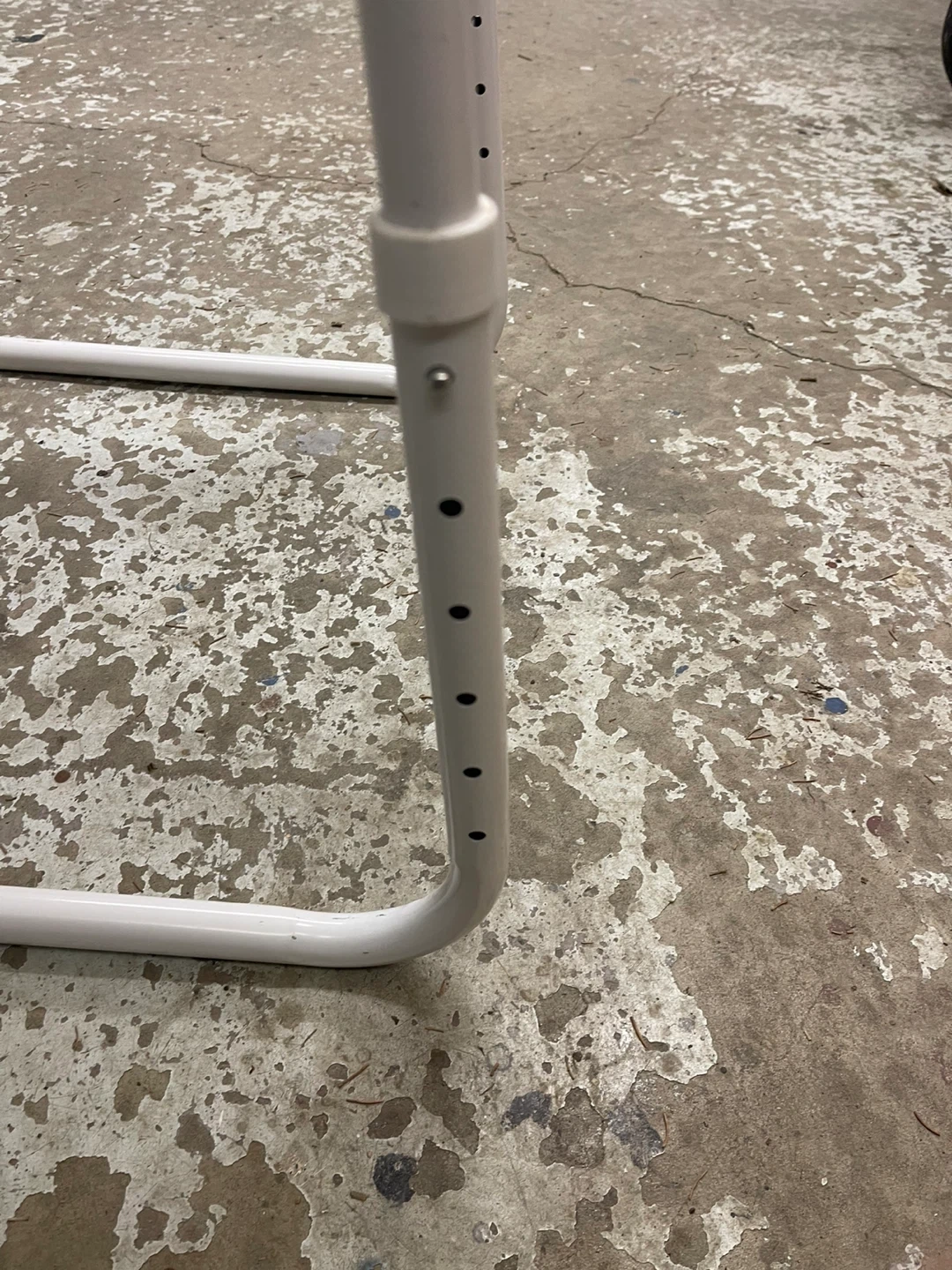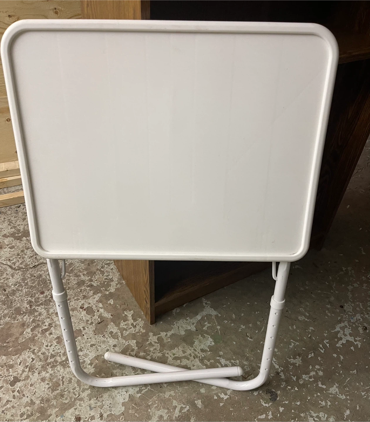 A handy white TV tray table with adjustable height settings. It's made of sturdy plastic and metal. Folds away easily for storage. Hight 21.5” to 27.5” x 20.5”W x 15.5”D. Cash only.
