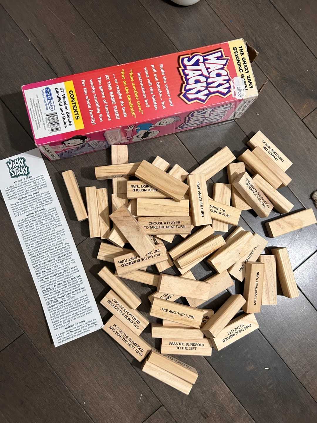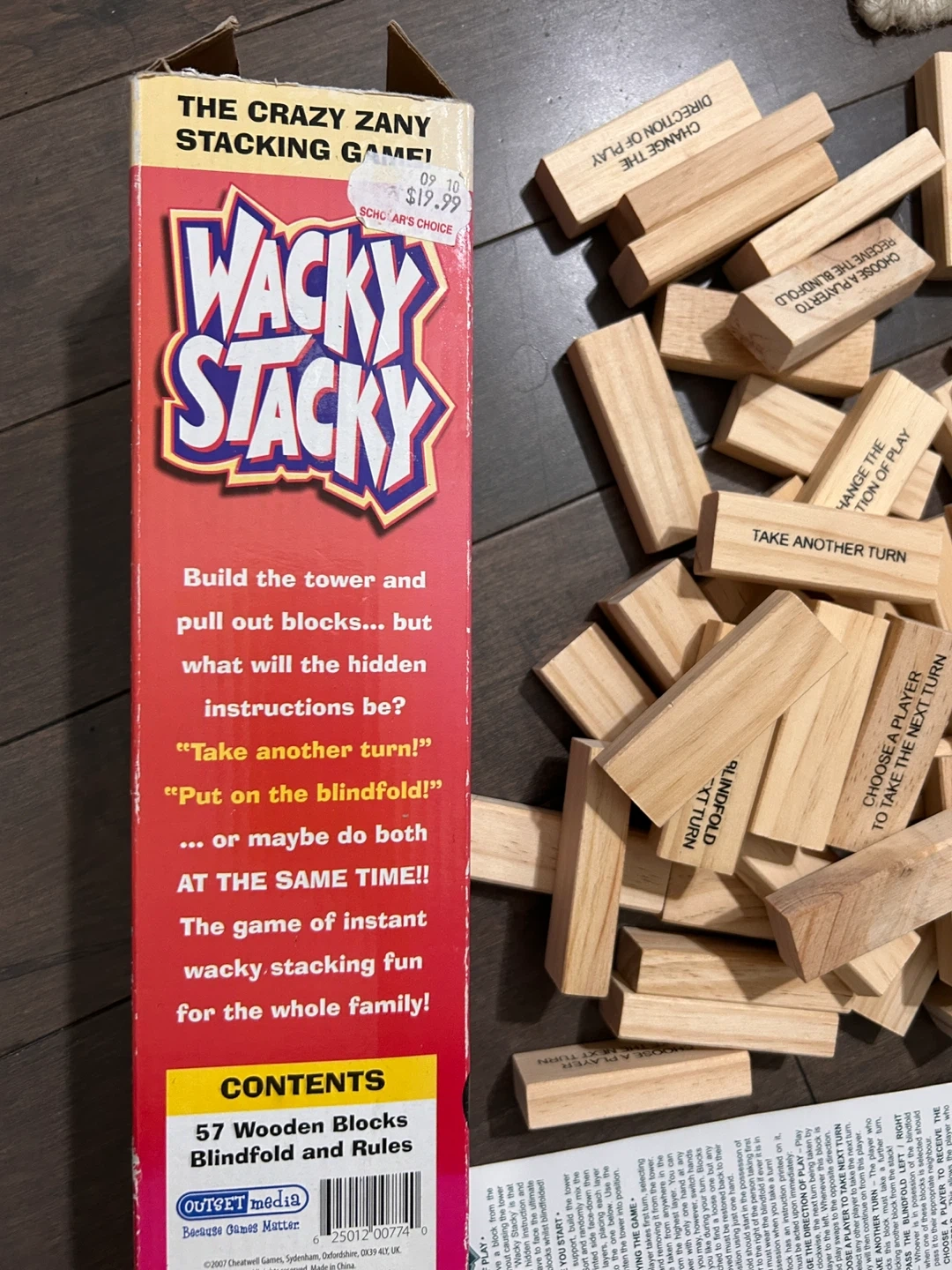 181Get ready for some family fun with this Wacky Stacky stacking game! This crazy zany game includes 57 wooden blocks, a blindfold, and the rules. It's perfect for 2+ players and recommended for ages 8+. The box shows that it was originally priced at $19.99.