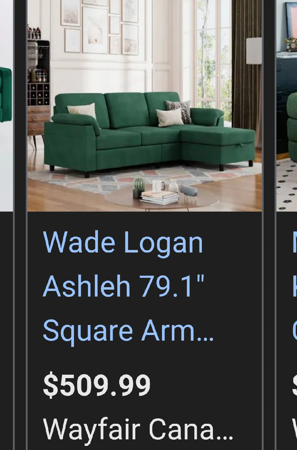 This is a Wade Logan Ashleh sofa, perfect for a living room or den. It features a square arm design and measures 79.1 inches. Originally purchased for $509.99, this sofa is a great addition to any home