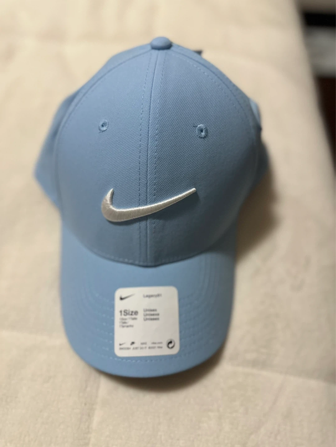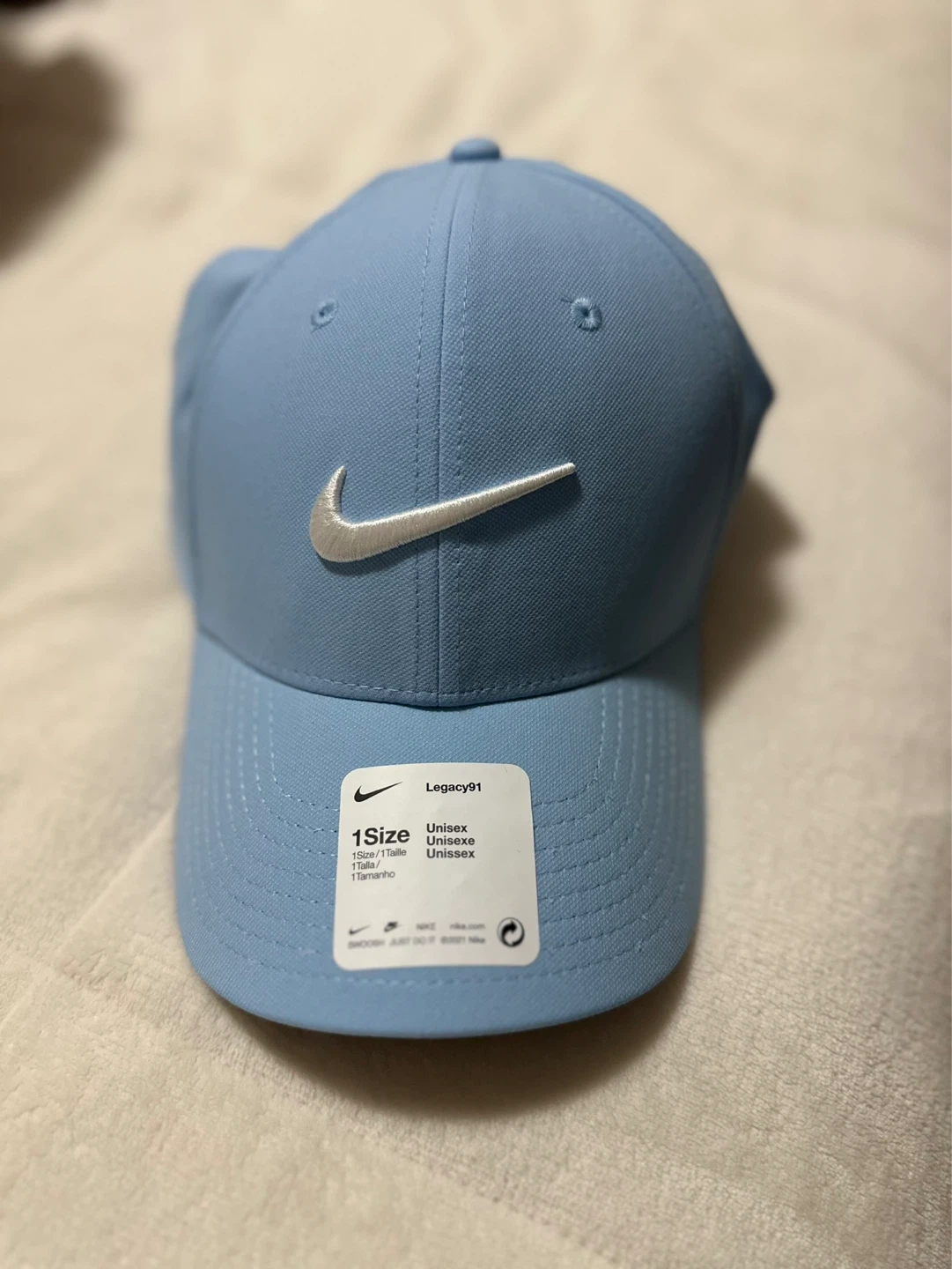 A light blue Nike Legacy91 cap with a white swoosh. It's one size fits all and features Dri-FIT technology. This cap is Adult unisex.