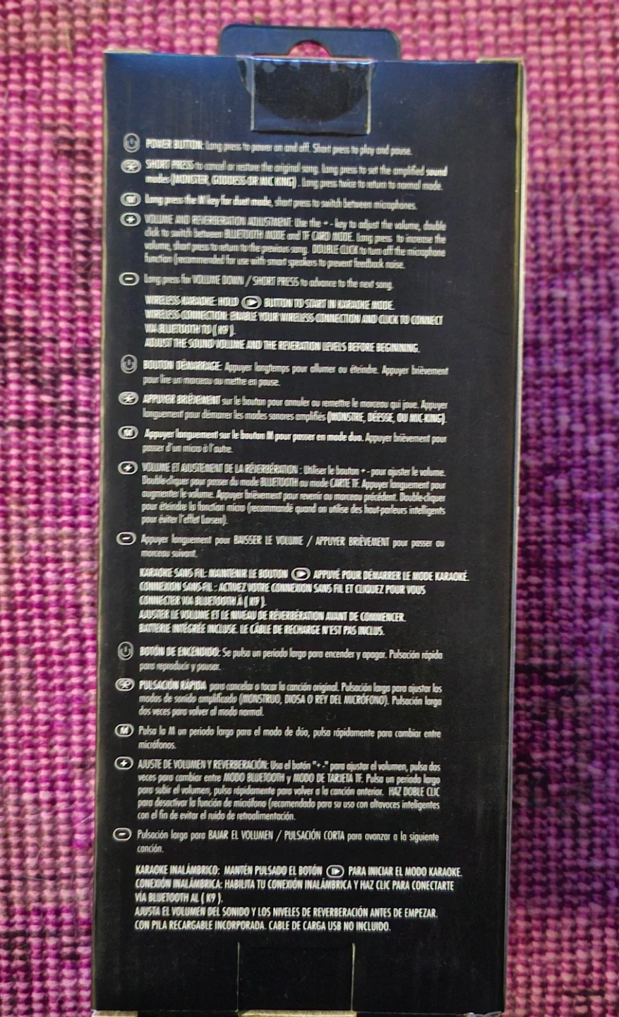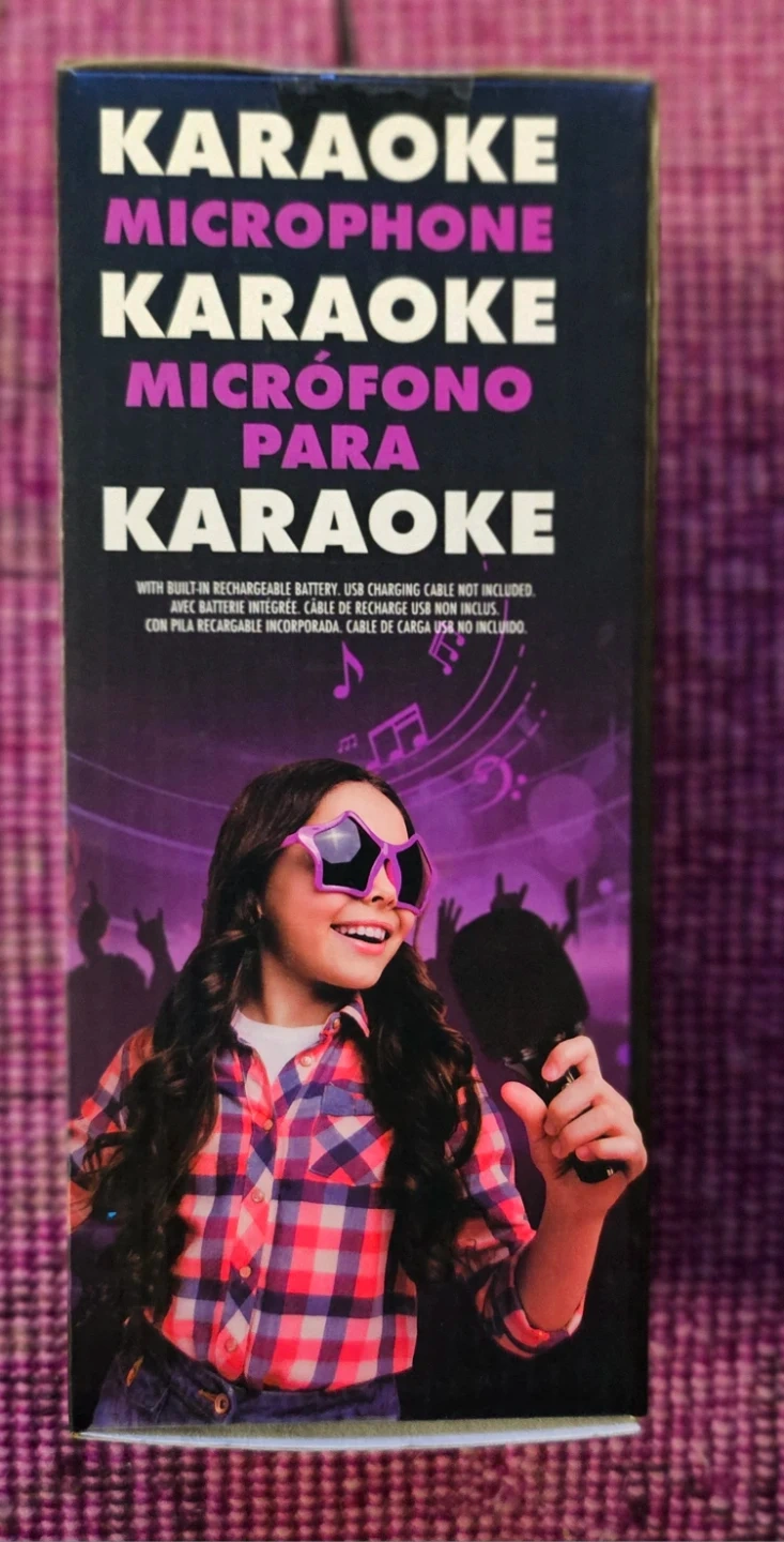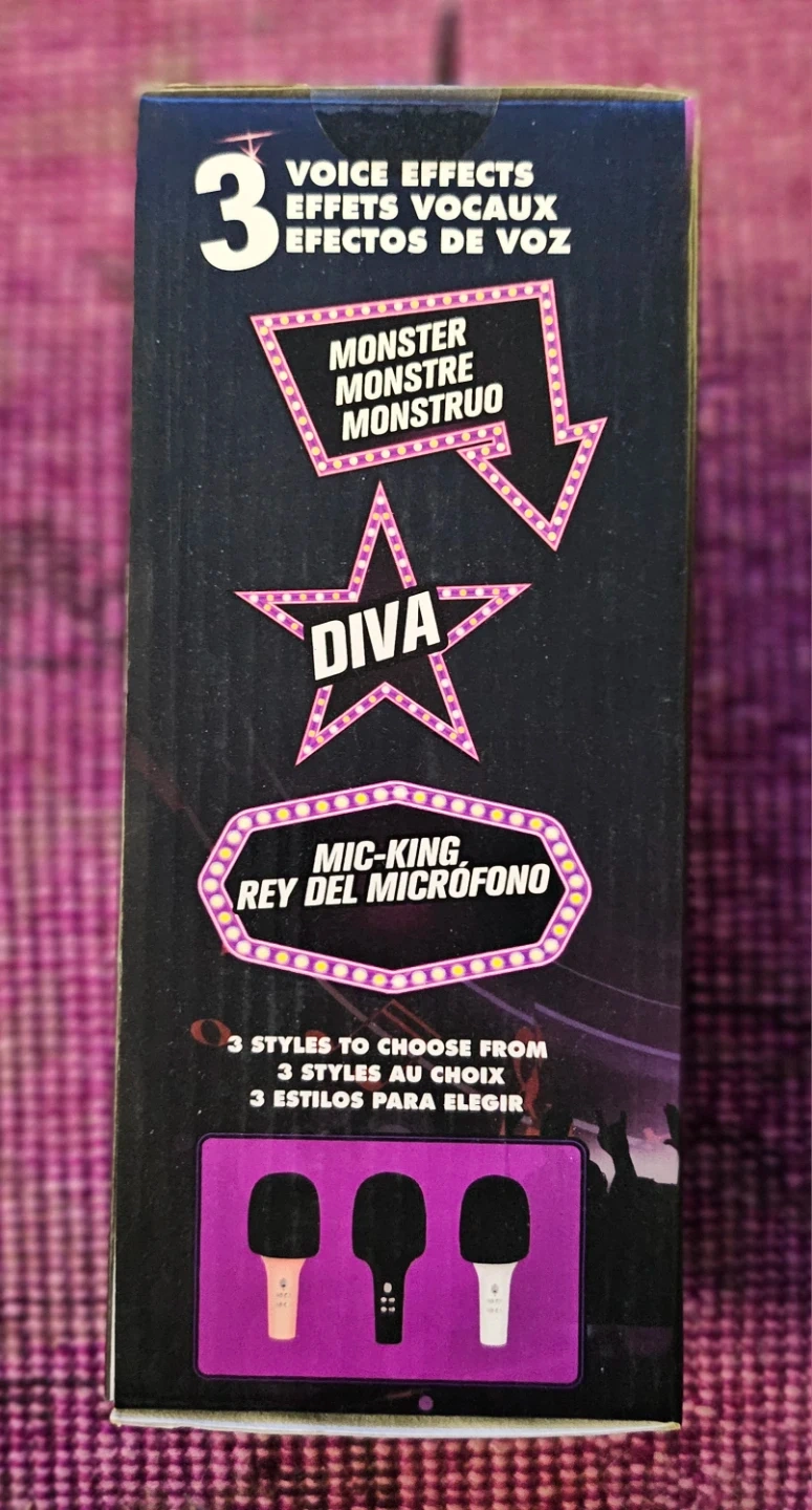 Wireless karaoke microphone with 3 voice effects: Monster, Diva, and Mic-King. It's built-in rechargeable battery and USB charging (cable not included). This microphone is great for parties or performances!