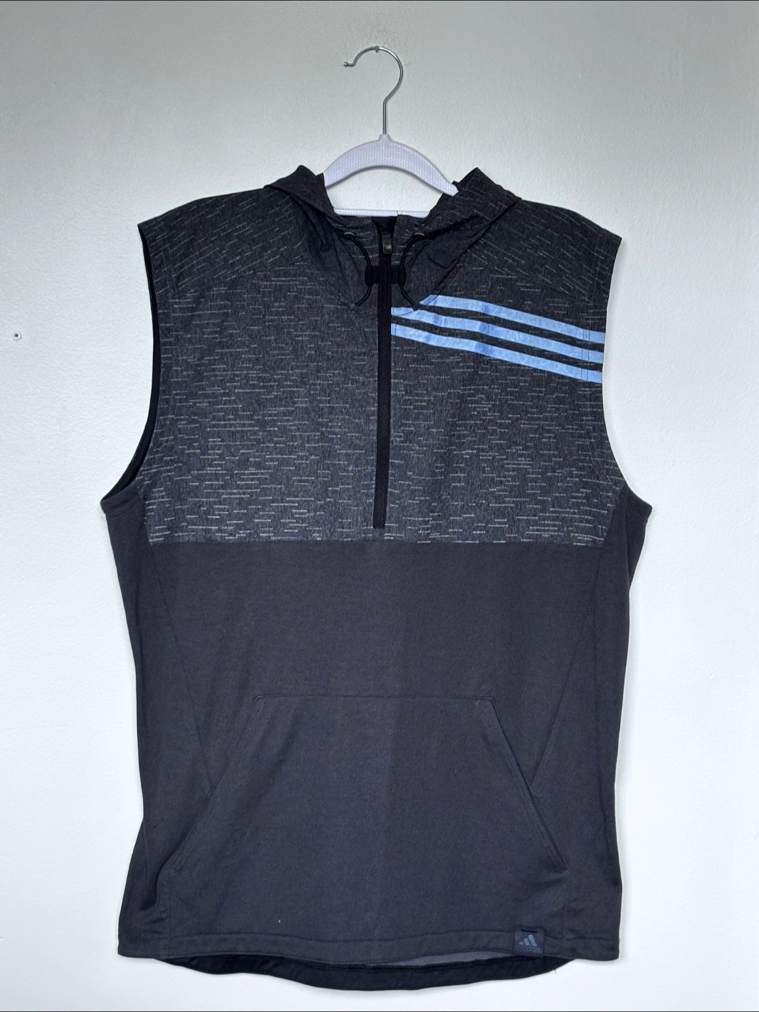 This Adidas Climalite sleeveless hoodie is perfect for workouts or casual wear! It features a stylish grey colour and is made from Climalite material, which is designed to keep you cool and dry. It's a size medium and in great condition.