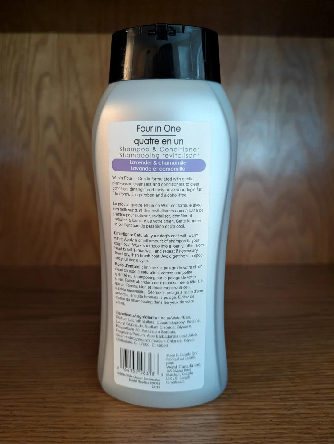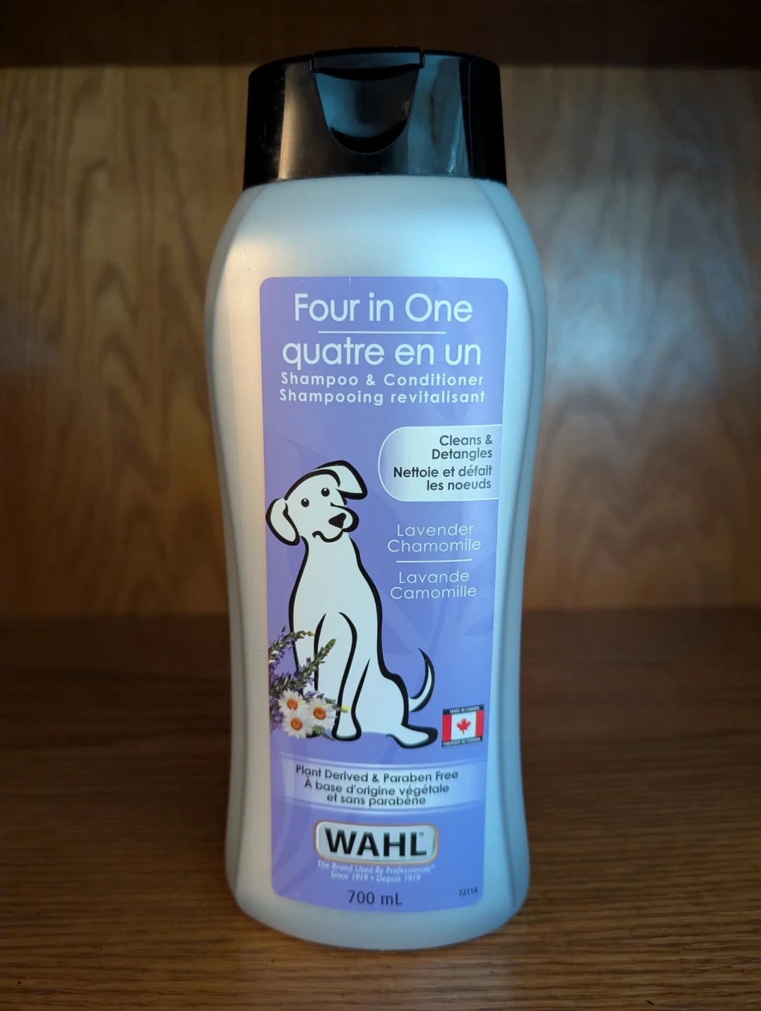 42Selling a bottle of Wahl Four in One Shampoo & Conditioner for dogs! It's the lavender & chamomile scent, perfect for gently cleaning, conditioning, detangling, and moisturizing your dog's fur. The formula is plant-derived and paraben-free. The bottle contains 700 mL.