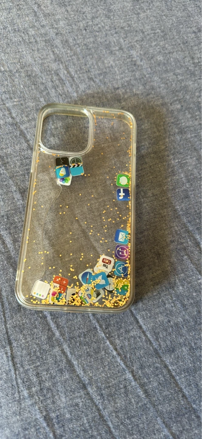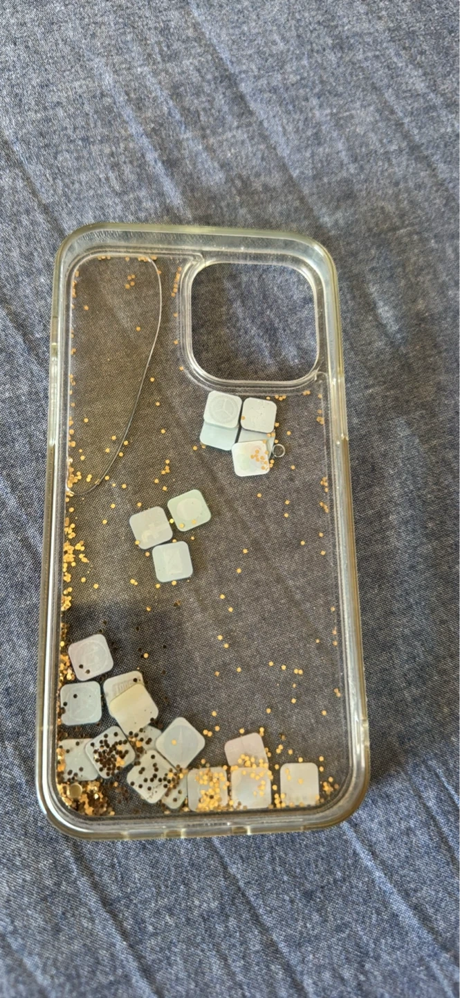 This clear case for your iPhone 12 Pro Max is filled with gold glitter and fun charms. It offers protection while adding a playful touch to your phone. The charms inside move around when you shake it!