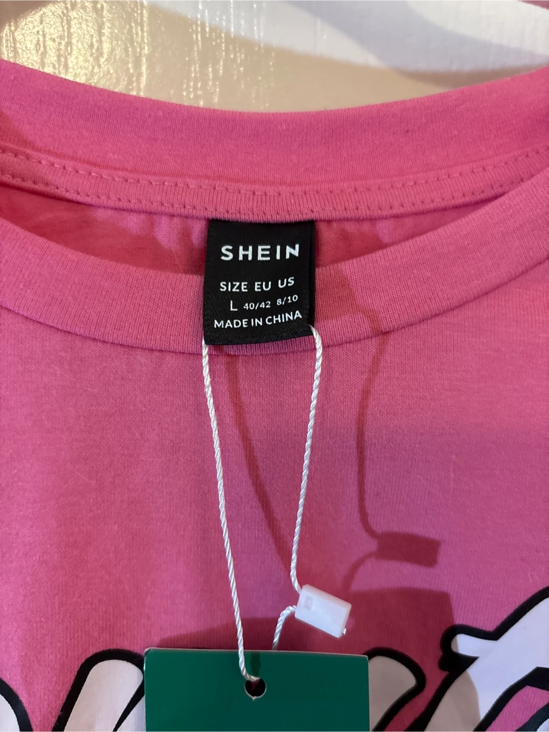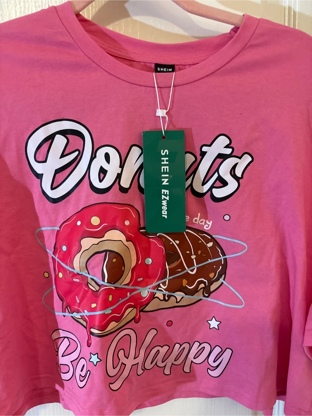 This bright pink cropped t-shirt features a fun "Donuts Be Happy" graphic with donuts. It's a size large (EU 40/42, US 8/10). Great for casual wear! Loose fit.