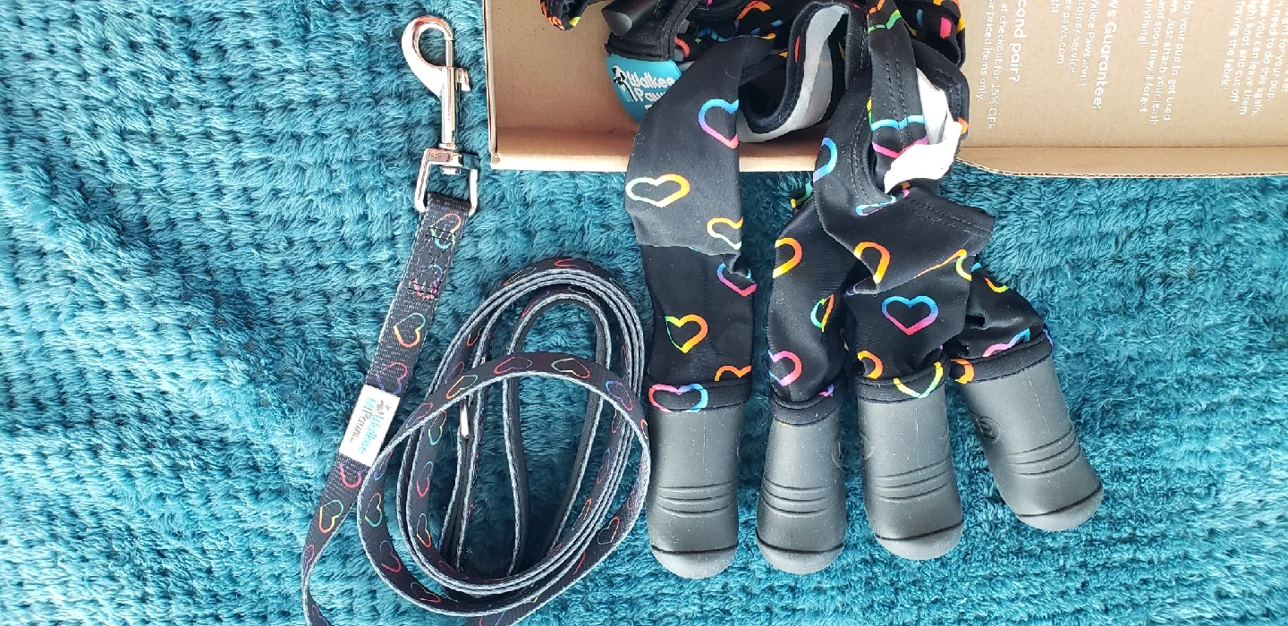 86Keep your furry friend stylish and protected with this Walkee Paws set! Includes a leash and a pair of leggings, both featuring a cute heart pattern. Perfect for walks in any weather! XS Tall Perfect for Shiba Inu or similar size furry friend. New - never worn