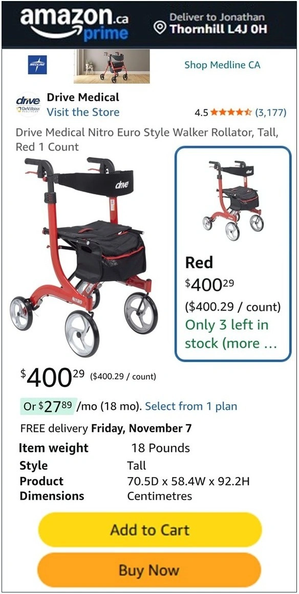 67BRAND NEW - 50% OFF RETAILS FOR $425 AT SHOPPERS DRUG MART WELLWISE & $400 ON AMAZON (SEE SCREENSHOTS) PICK UP IN THORNHILL Features and Benefits • Easily collapse rollator to ultra-compact size with one hand by pulling seat grip up and bringing sides together so handles almost touch • Sophisticated design features lightweight aluminum frame with built-in brake cable for extra safety and protection • A comfortable nylon seat and handle height adjustability provide universal relief that feels customized • Features large front wheels crafted to increase turning radius and a sleek removable zippered storage bag for secure convenience Product Specifications • Actual Product Weight: 17.5 lbs • Casters: 10" • Handle Height (Max): 41" • Handle Height (Min): 36" • Number of Wheels: 4 • Overall Product Height: 36.3" • Overall Product Length: 27.75" • Overall Product Width: 23" • Primary Product Color: Red • Primary Product Material: Aluminum • Product Weight Capacity: 300 lbs • Seat Depth: 10" • Seat Width: 18" • Seat to Floor Height: 23.6" BRAND NEW - 50% OFF RETAILS FOR $425 AT SHOPPERS DRUG MART WELLWISE & $400 ON AMAZON (SEE SCREENSHOTS) PICK UP IN THORNHILL