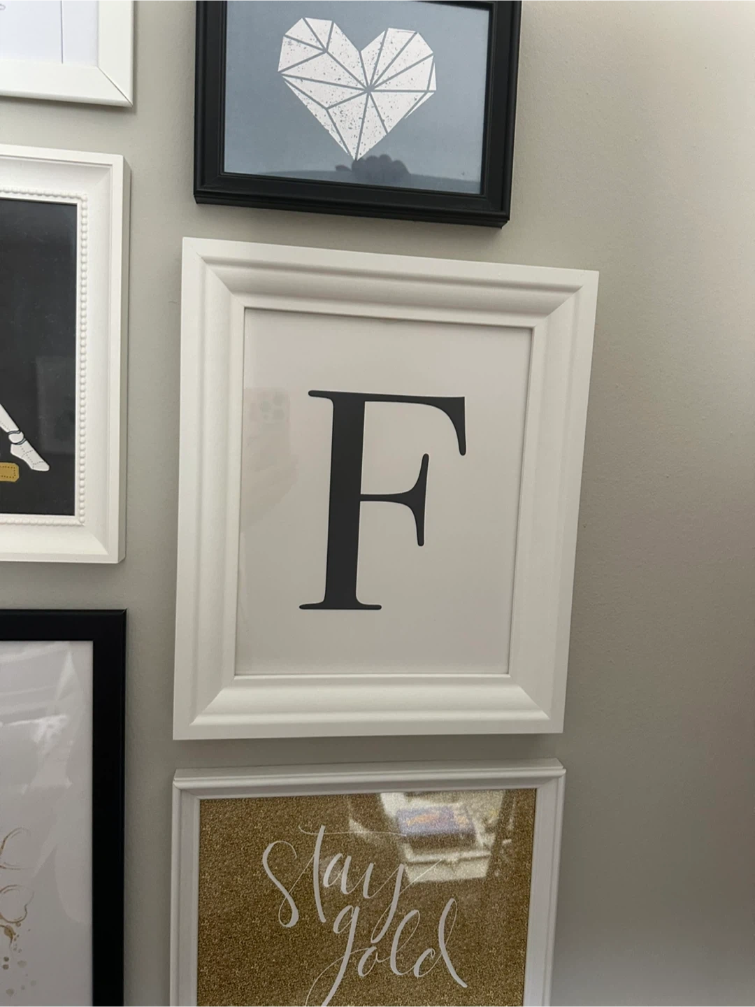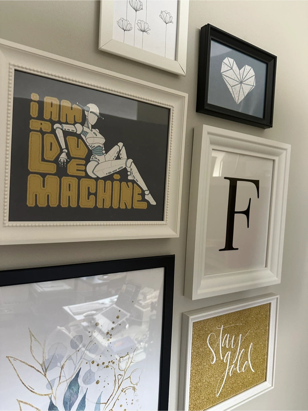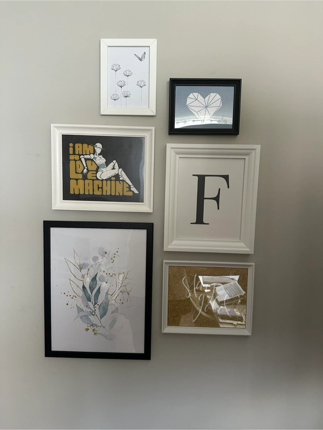 A collection of framed art prints to brighten up your space. Includes various designs and frame styles. Perfect for adding a touch of personality to any room. All arts were customized for this set of frames — you won’t find the same set anywhere else. It’s exclusive and unique. 🖼️ Suggestion: Replace the “F” with your own name initial to make it personalized to your space. Or use the couples’ initials. Includes: 6 frames (4 in white and 2 in black) from IKEA and all arts. -> Outlined butterfly and flowers -> Origami heart -> I am a Love Machine -> F (initial) -> Leaves in green and gold -> Stay Gold