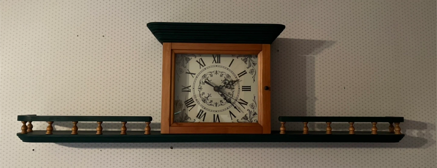 60Selling a charming wall clock with an attached shelf. The clock has a wooden frame and a classic Roman numeral face. The shelf is a nice dark green and has a decorative railing. It would be a great addition to any room!