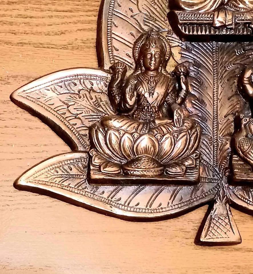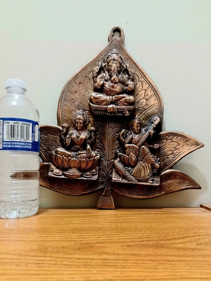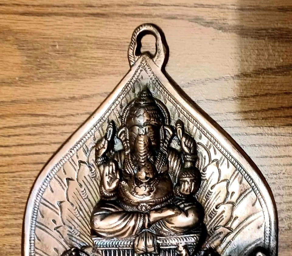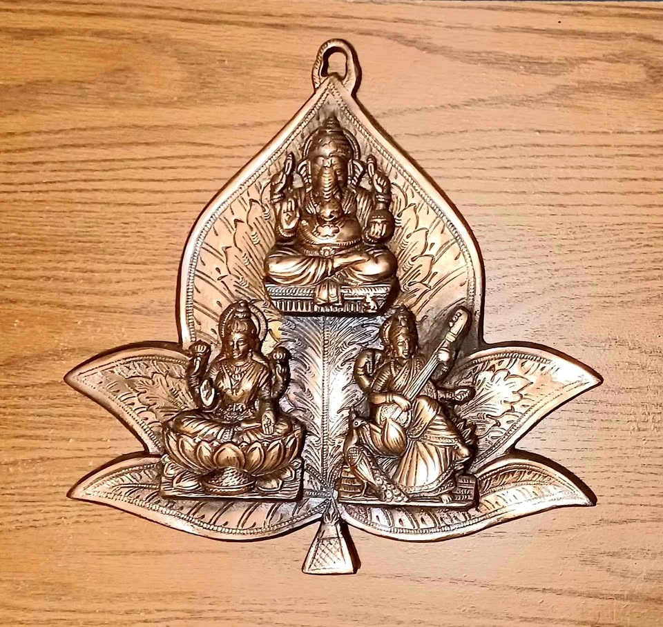 65Vtg.Wall Hanging featuring Hindu Deities on a Leaf. Specifically, it includes : Ganesha : The Elephant Headed god of beginnings, wisdom, & the remover of obstacles, is at the top. Lakshmi : The goddess of wealth, prosperity & fortune, is on the bottom left. Saraswati : The goddess of knowledge, music, arts, wisdom, and learning, is on the bottom right. The deities are positioned on a Stylized Leaf, commonly seen in depictions of Hindu gods. Very Good Condition Please check out my other rare collectibles!