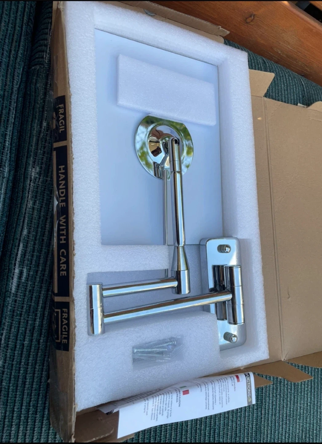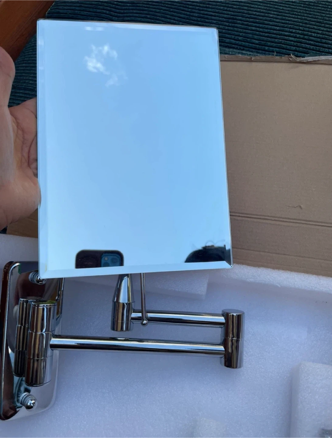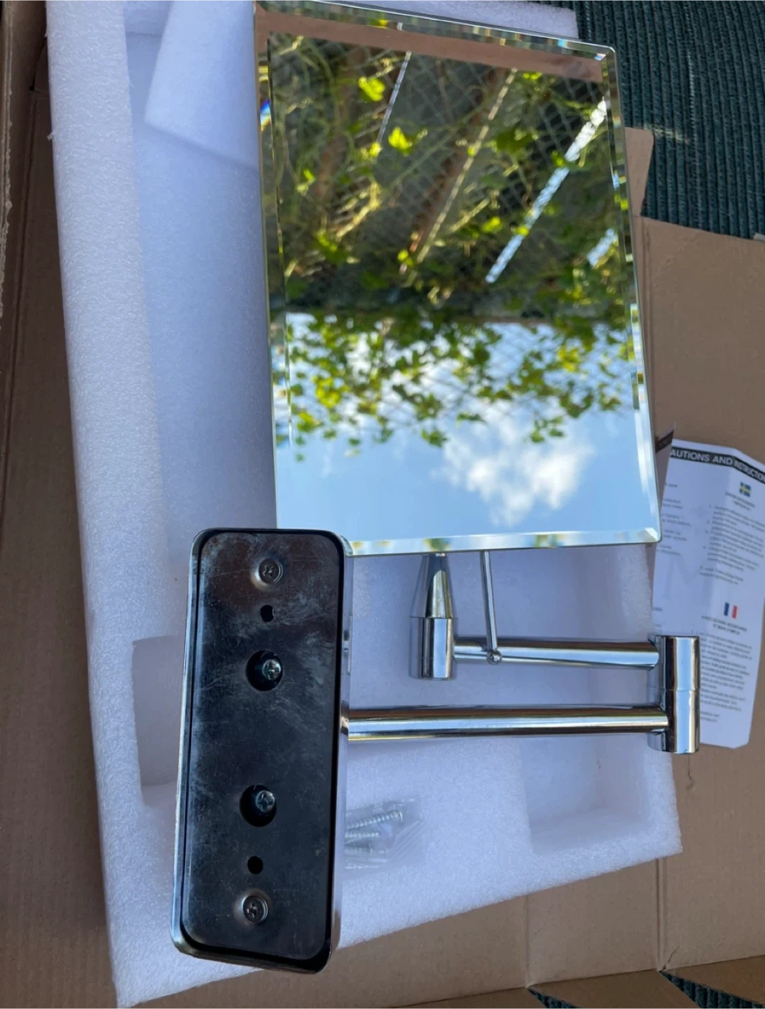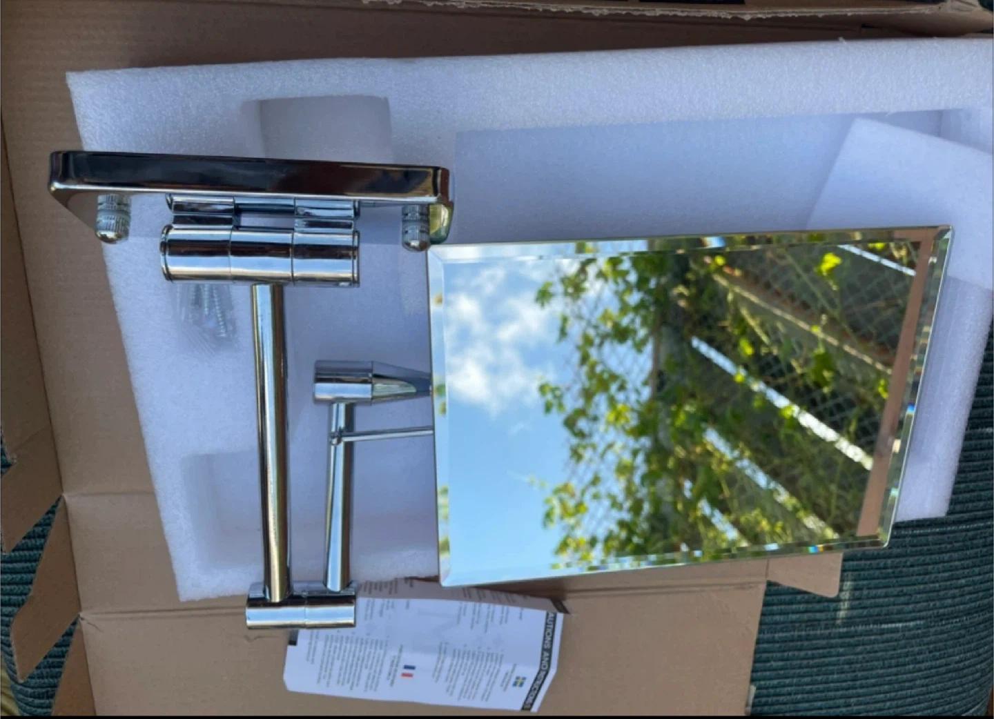 Selling a wall mount makeup mirror. It is in excellent condition and comes with the original box and all included components. This mirror is perfect for applying makeup or other grooming tasks, and its wall-mounted design saves space on your vanity or countertop
