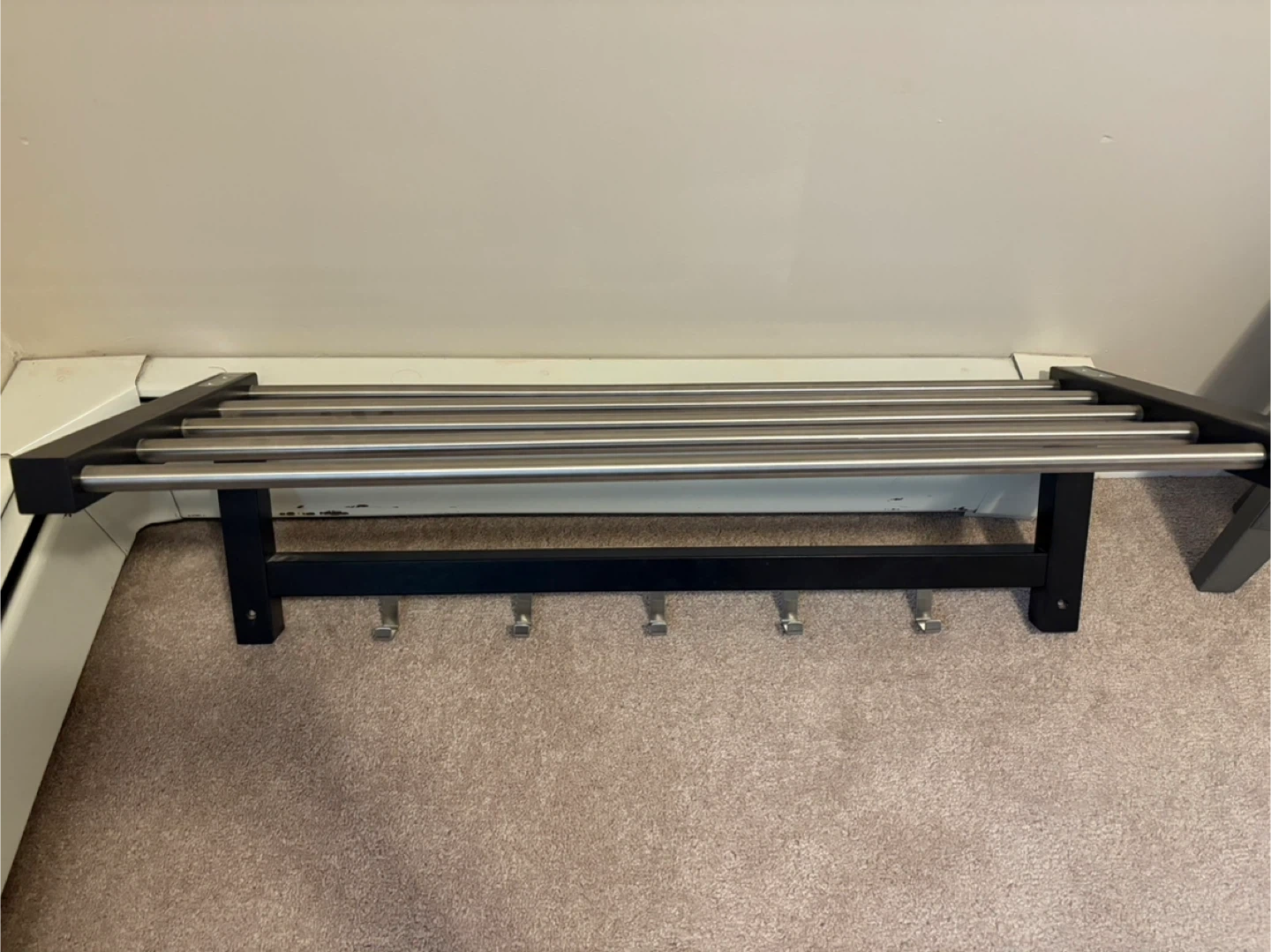 18Selling a gently used wall-mounted coat rack with a shelf. It features a sleek design with a black frame and silver-tone bars. Perfect for adding extra storage and organization to your entryway or closet! Retails at IKEA for $39.99