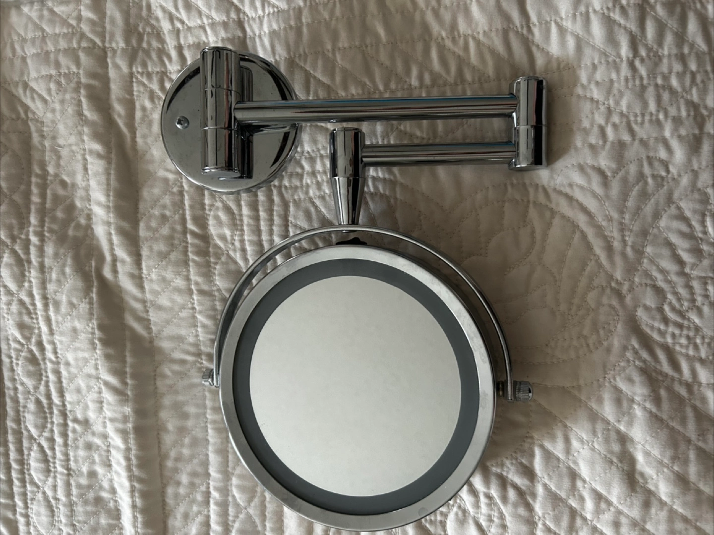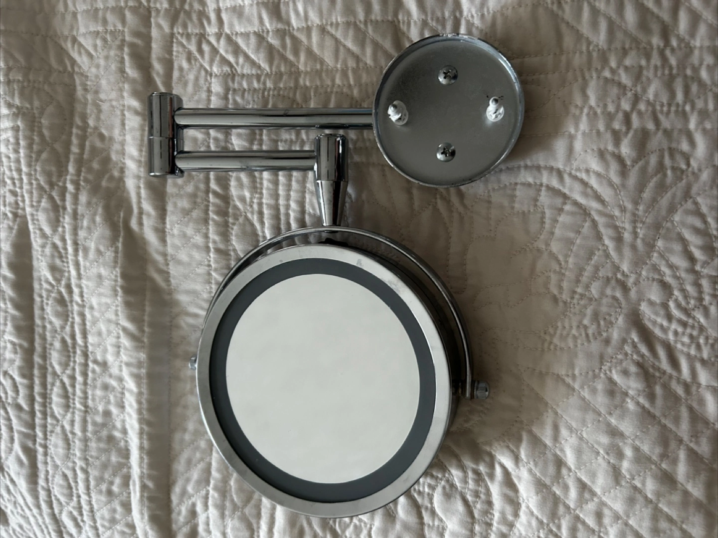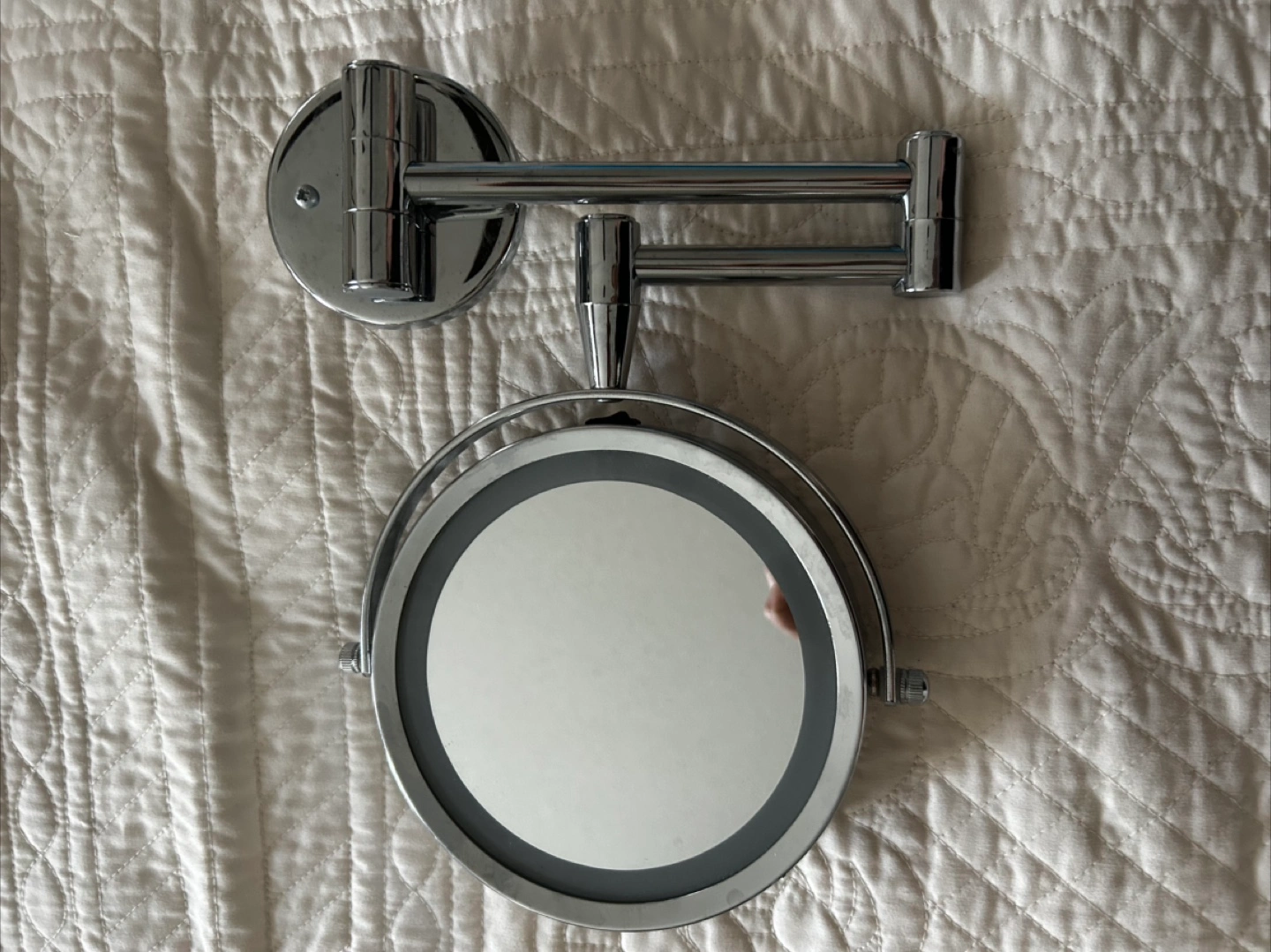 Selling a wall mounted makeup mirror. It's in great condition and ready to be installed in your bathroom or vanity area. It has a chrome finish, a magnification side and a ring light - requires batteries