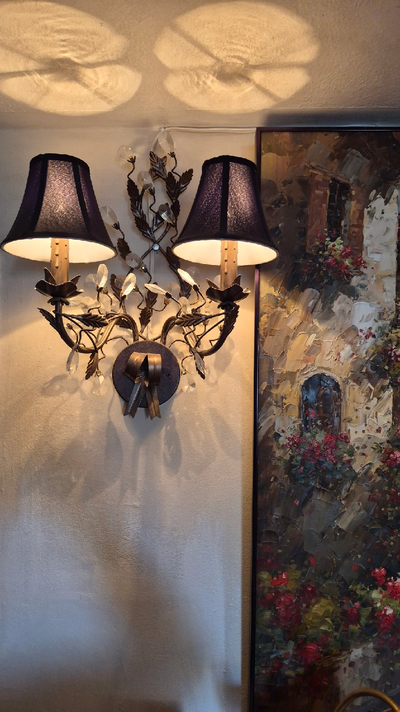Here's 4 charming wall sconce that would add a touch of elegance to any room! they features dark shades and decorative metalwork with crystal accents. Perfect for creating a warm and inviting atmosphere in your home