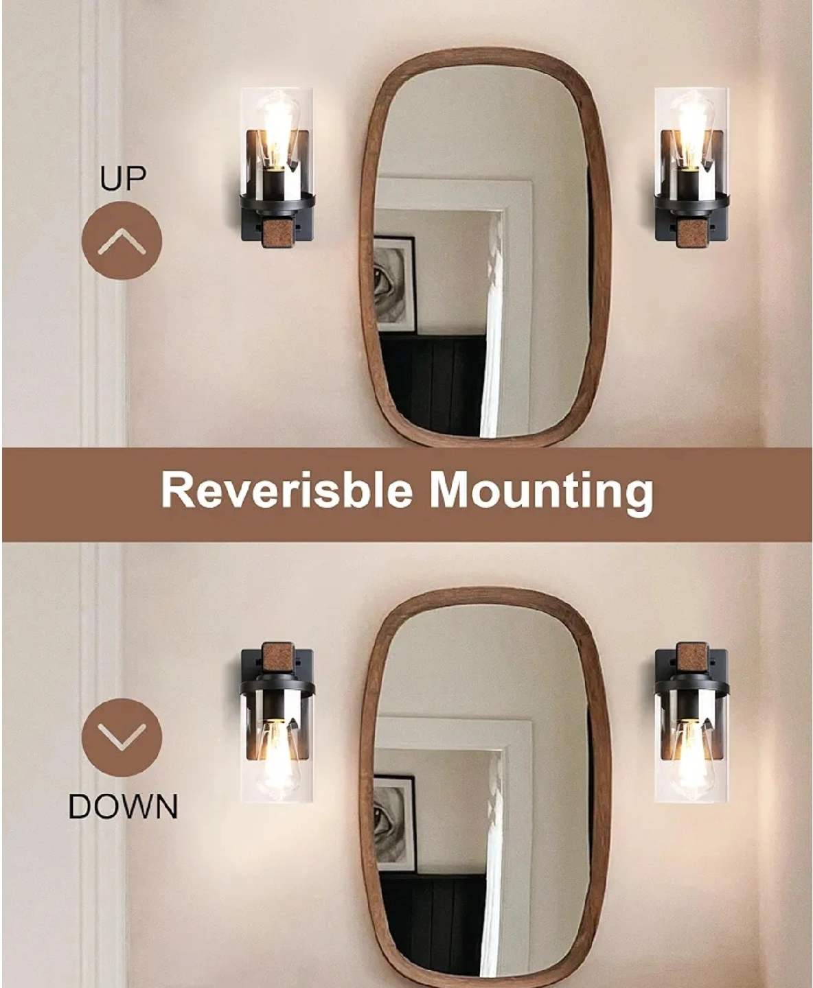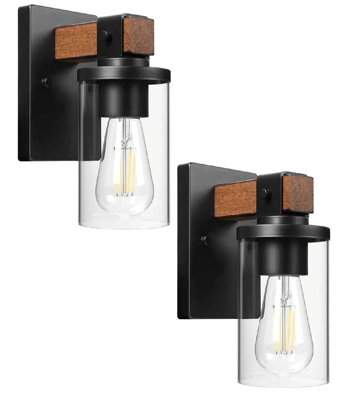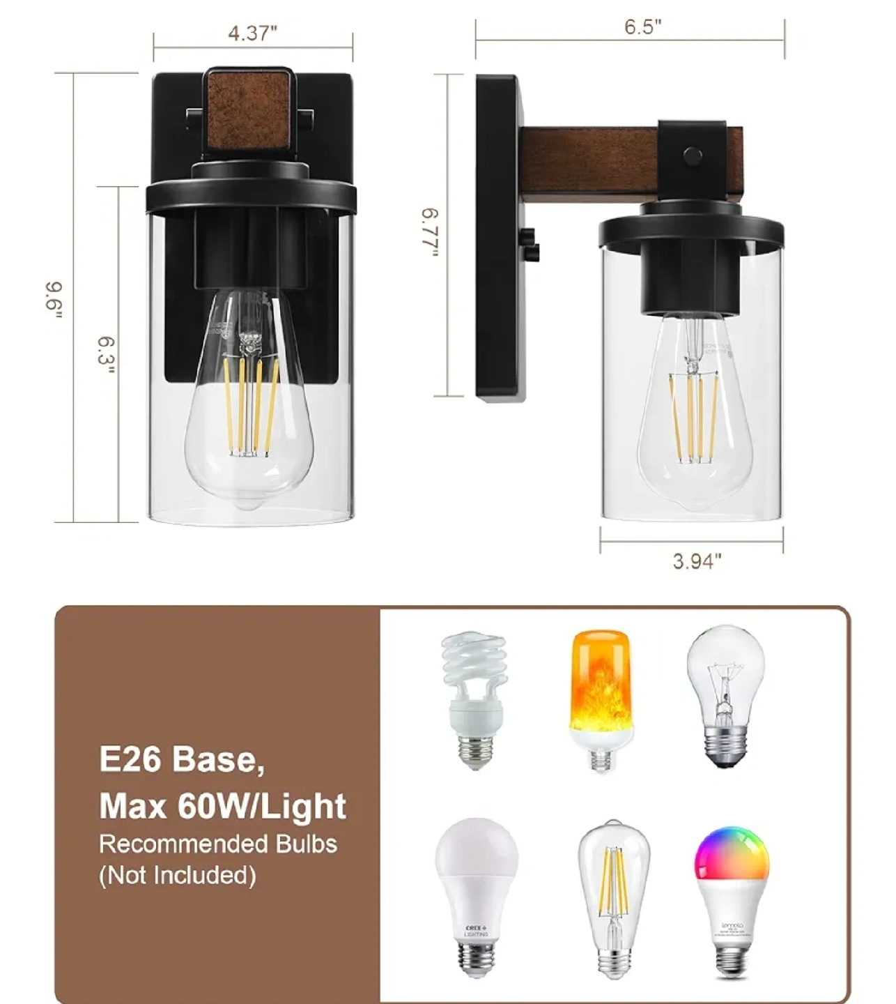 Selling a set of two wall sconce lighting fixtures. They feature a reversible mounting design, so you can install them facing up or down. They have a black finish with a wood accent. Bulbs are not included, but they use an E26 base and can handle up to 60W. The dimensions are approximately 9.6" tall, 4.37" wide, and extend 6.5" from the wall