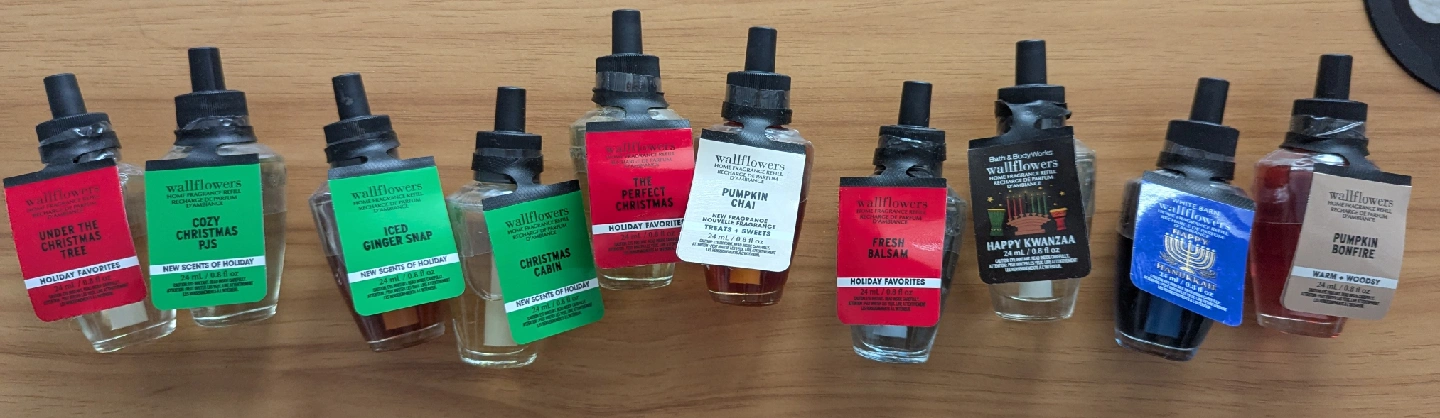 Selling a variety of Wallflowers home fragrance refills! Scents and amount of refills include: Under the Christmas Tree (14) Cozy Christmas PJs (3) Iced Ginger Snap (5) Christmas Cabin (5) The Perfect Christmas (2) Pumpkin Chai (1) Fresh Balsam (4) Happy Kwanzaa (3) Hannukah (3) Pumpkin Bonfire (4) Mystery Pumpkin scent (1). All are 24 ml / 0.8 fl oz Originally $8.95 Each Now $2.00 Each CASH ONLY