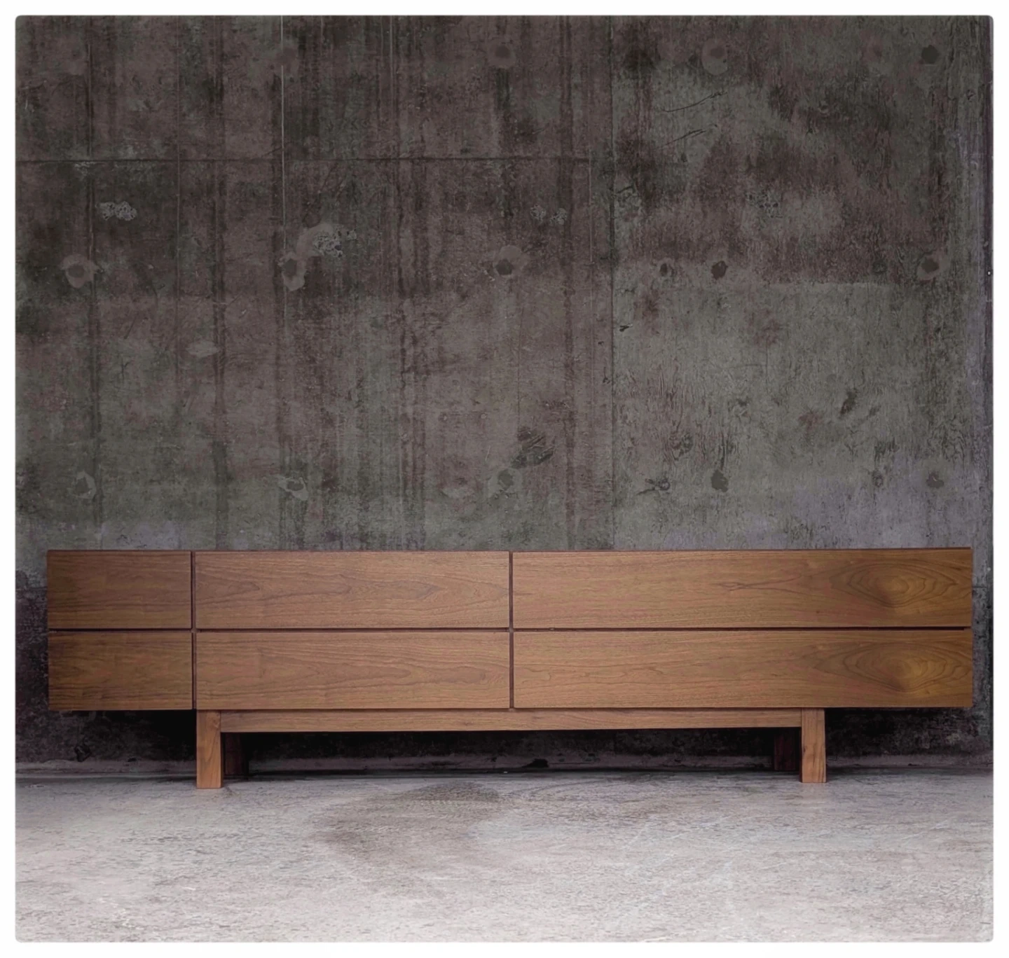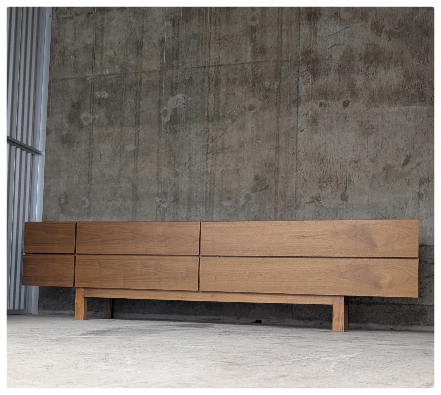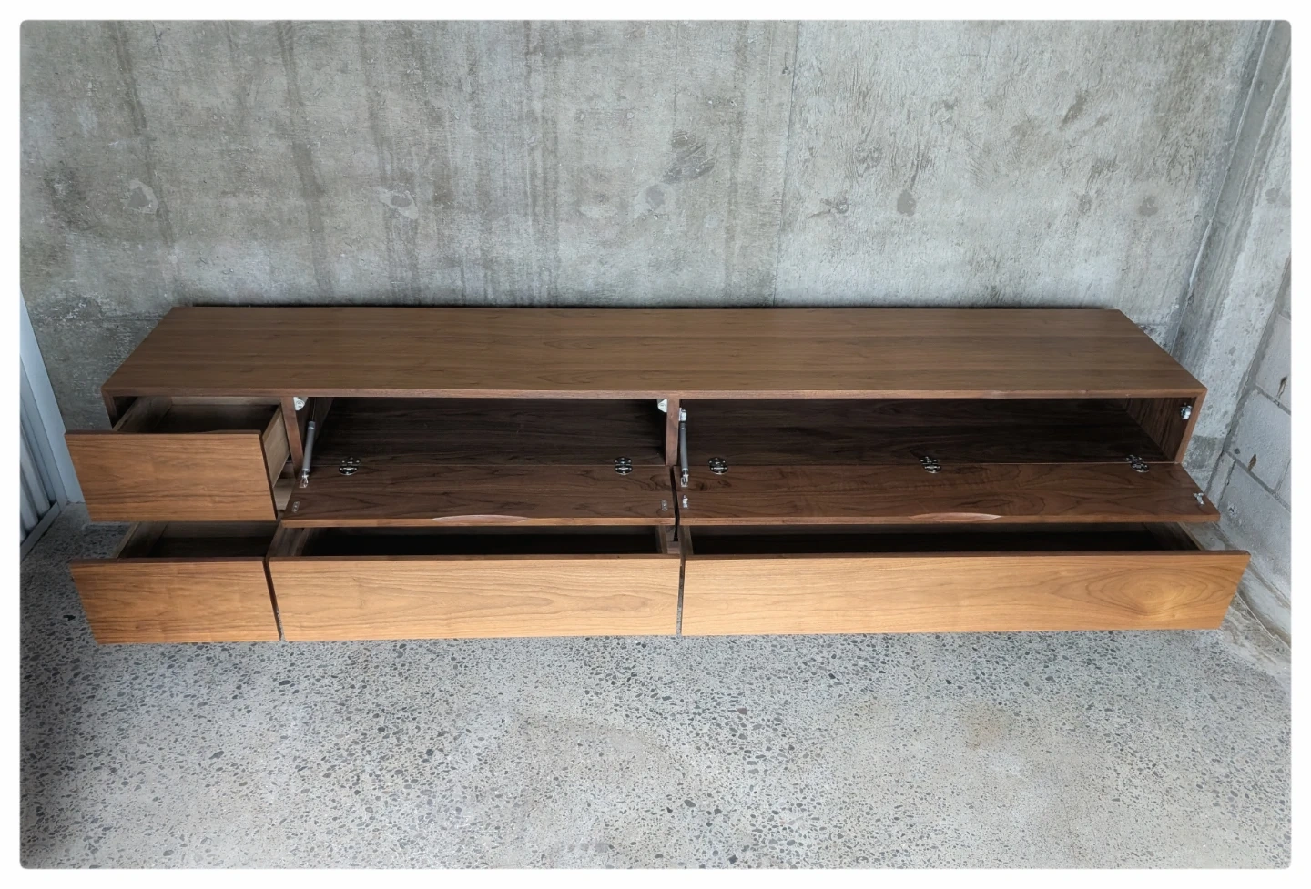 78Gorgeous Walnut credenza/sideboard/media unit by BluDot Stunning design with great functionality .4 pull out drawers and 2 large top drawers with drop down doors .Back side has holes for wires and cables . It's a very large and heavy unit so please double check the measurements prior to purchase 90.5" L x 19" D x 23" H It has minor signs of wear (small scratches on a surface - not very visible in person) Pick up in Whitby or delivery can be arranged
