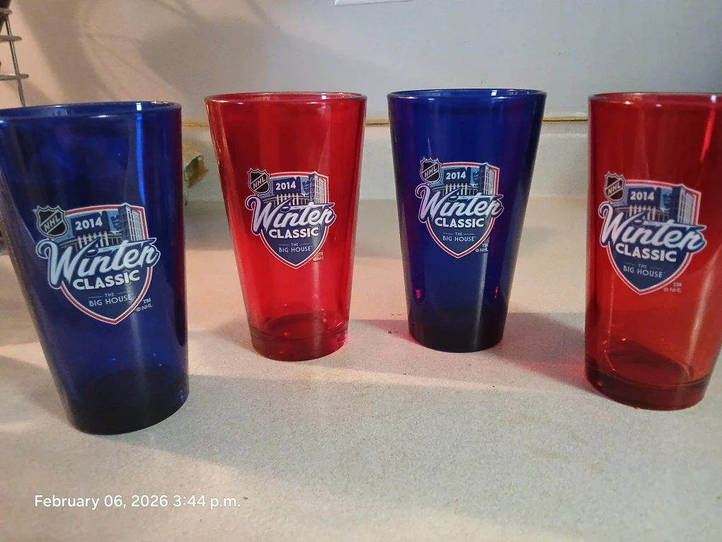 A set of four souvenir cups from the 2014 NHL Winter Classic, "The Big House" event. Includes two blue and two red cups. NHL branded. Great for hockey fans! Some staking wear on 2 glasses. Make an offer as is.