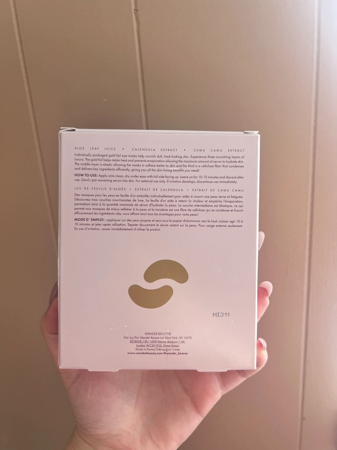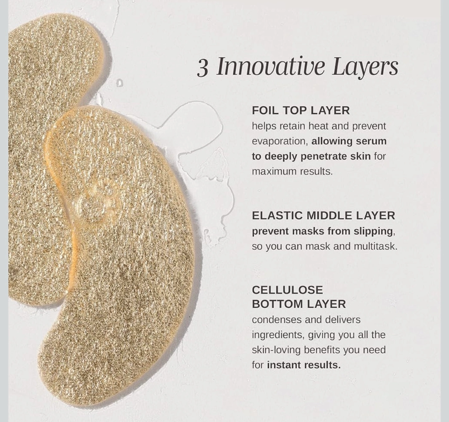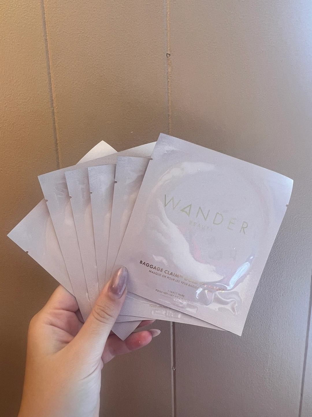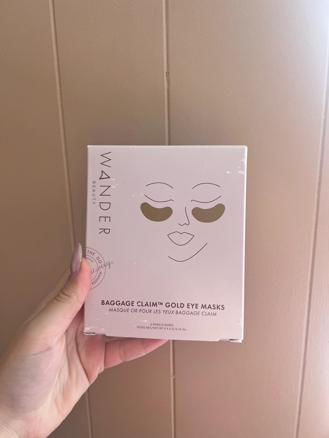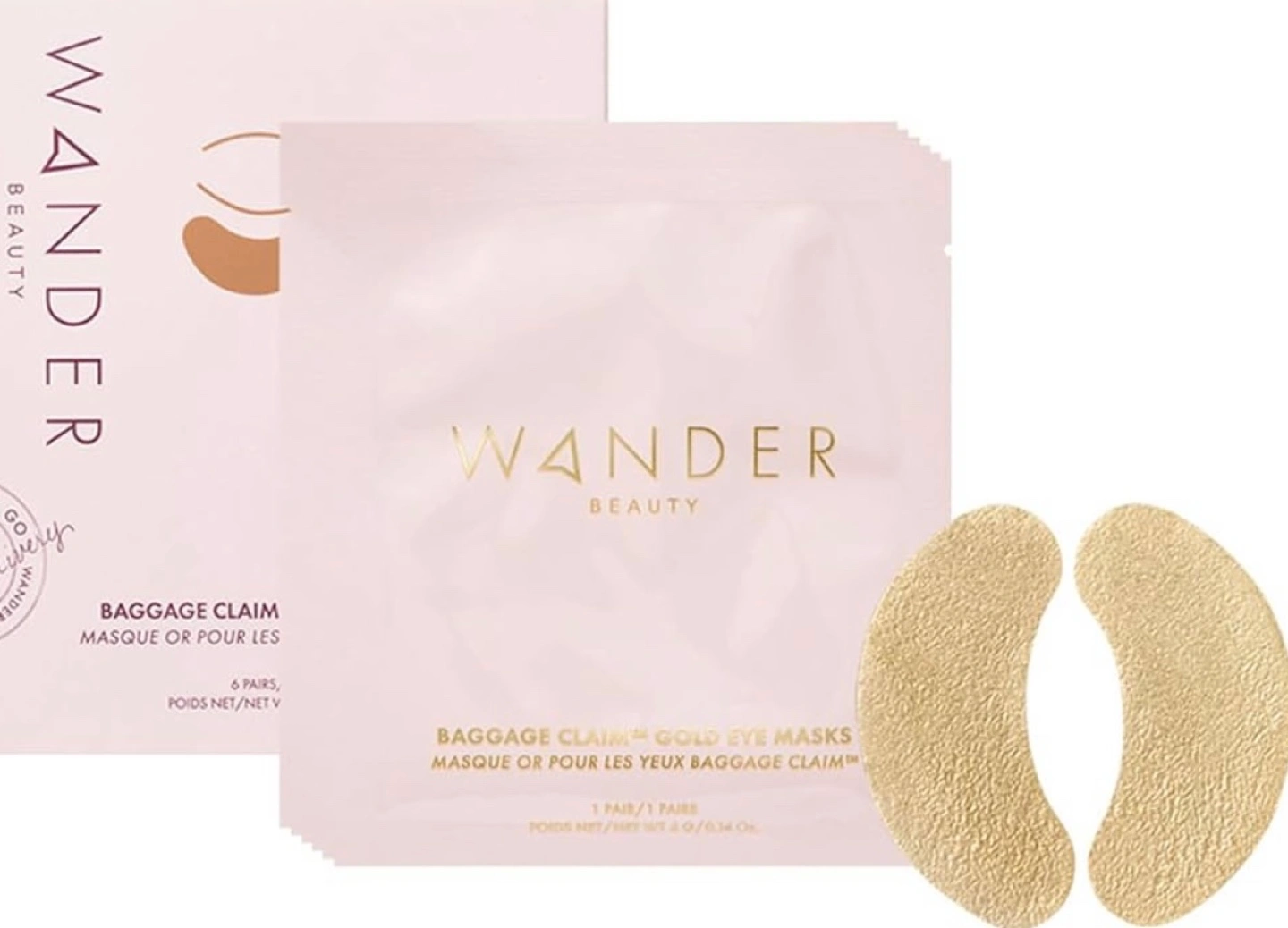 104These Wander Beauty Baggage Claim Gold Eye Masks are designed to hydrate the skin and diminish the appearance of fine lines and wrinkles They feature a foil top layer to retain heat and prevent evaporation, an elastic middle layer to prevent slipping, and a cellulose bottom layer to deliver skin-loving ingredients