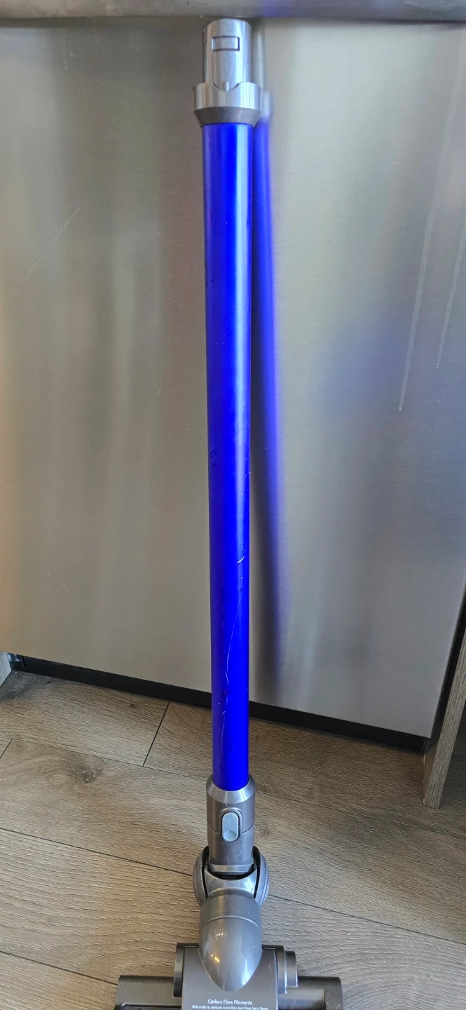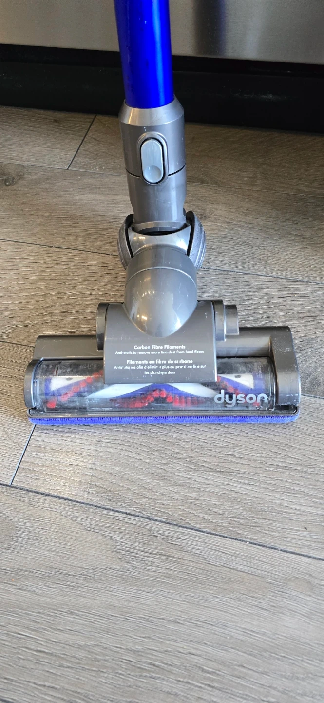 This is a Dyson DC45 Animal cordless vacuum cleaner with a blue wand. It features carbon fibre filaments on the cleaner head. It's great for keeping your floors tidy! This vacuum is excellent for pet owners.
