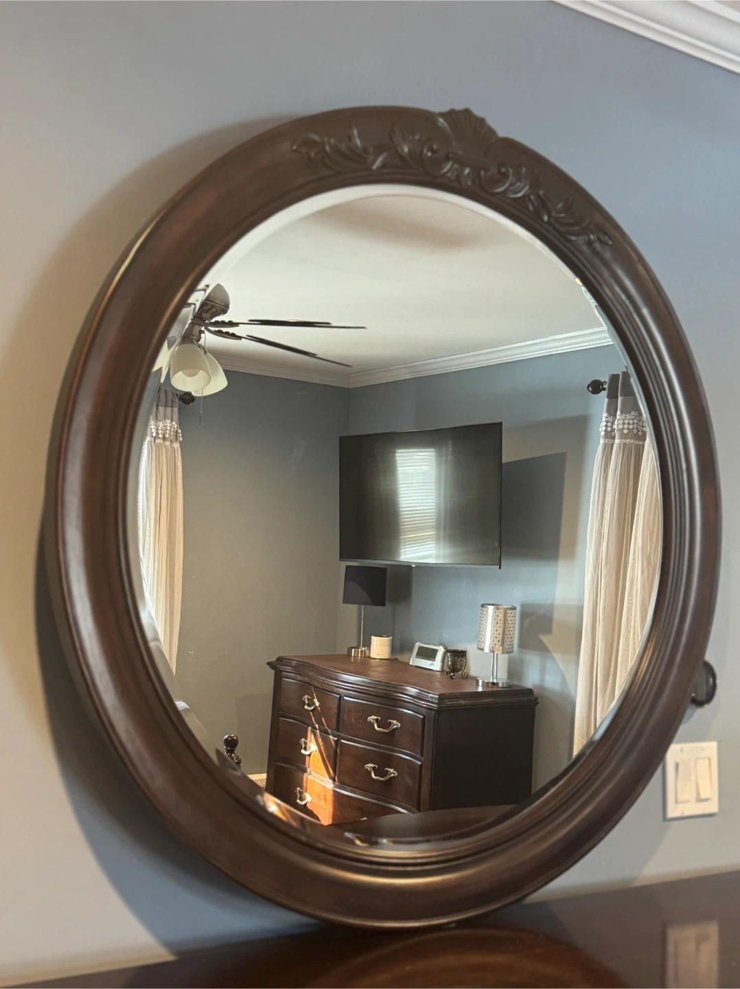 Bernhardt Furniture bought in 2008. 4 poster bed, (headboard, footboard and rails only) the posts can be changed to give you 3 sizes. This round mirror has a dark wood frame with ornate detailing. 12 drawer dresser with mirror and 5 drawer dresser. This was bottom half of an armoire. The top is painted. The set is in good condition with minor scratches from wear.