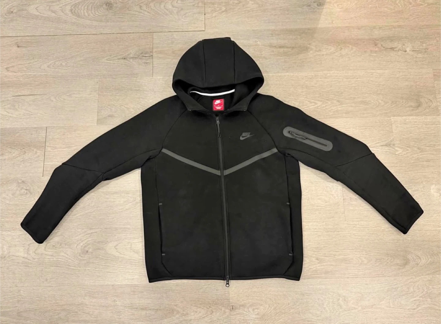 Nike Tech Fleece full zip hoodie in black. It's a black hoodie with a zip-up closure. Features zippered pockets and a hood.Size L