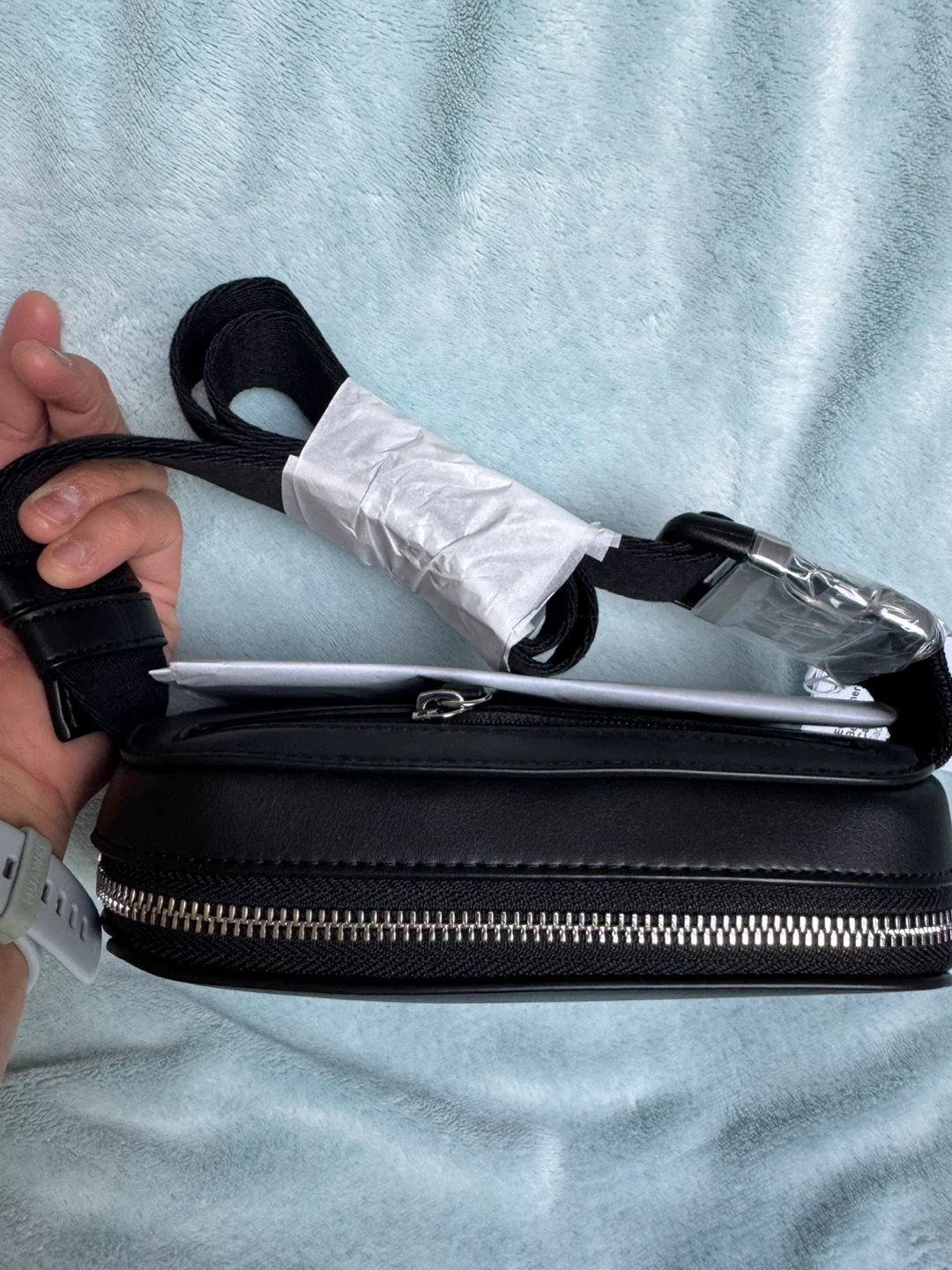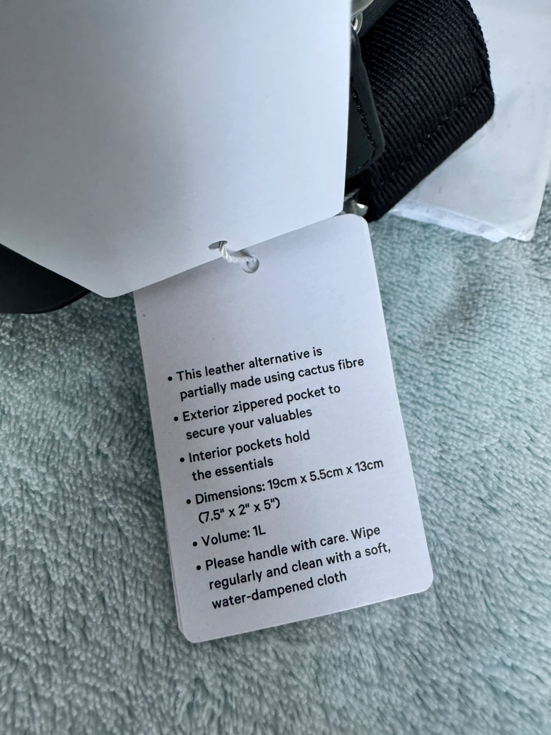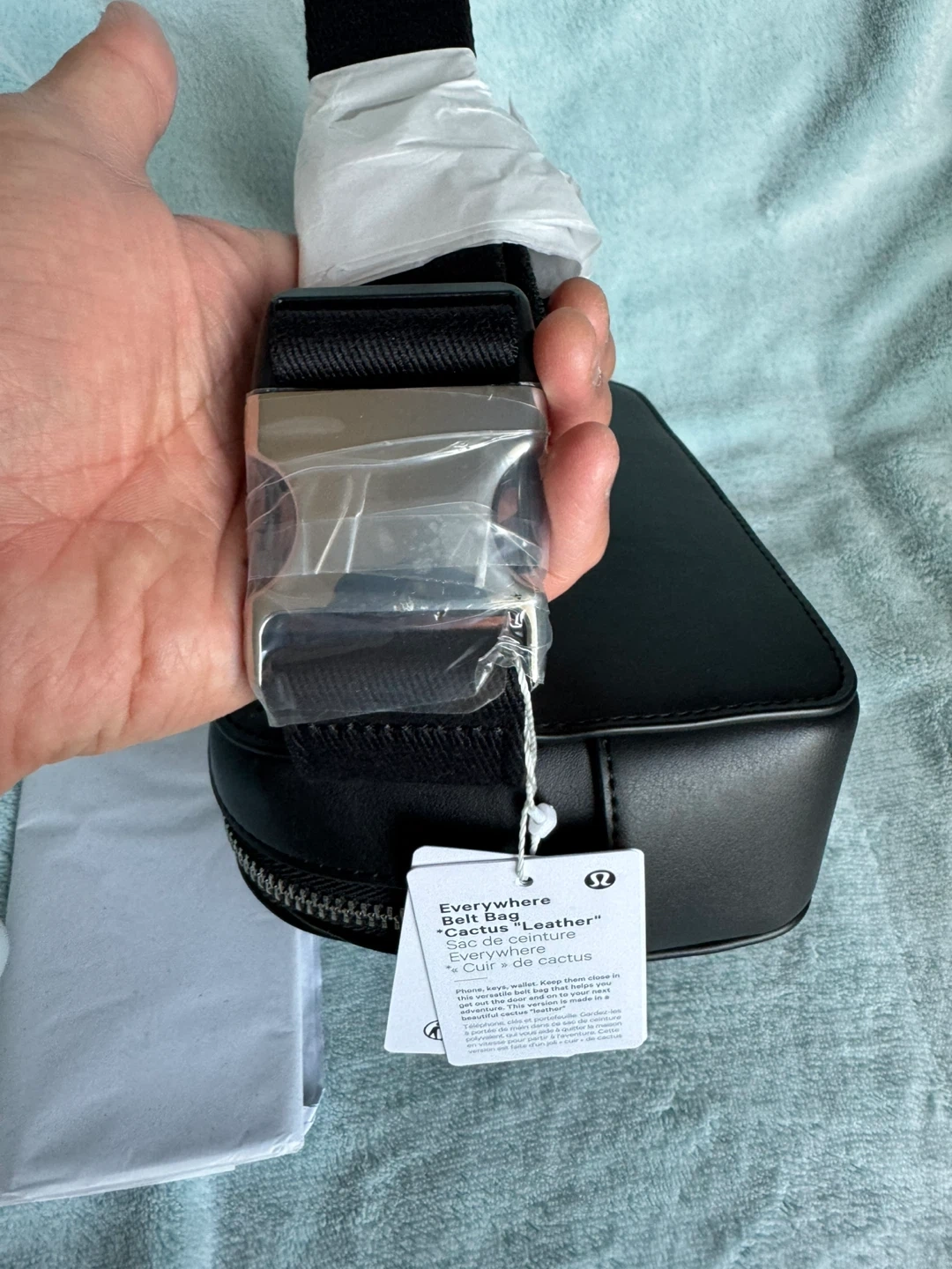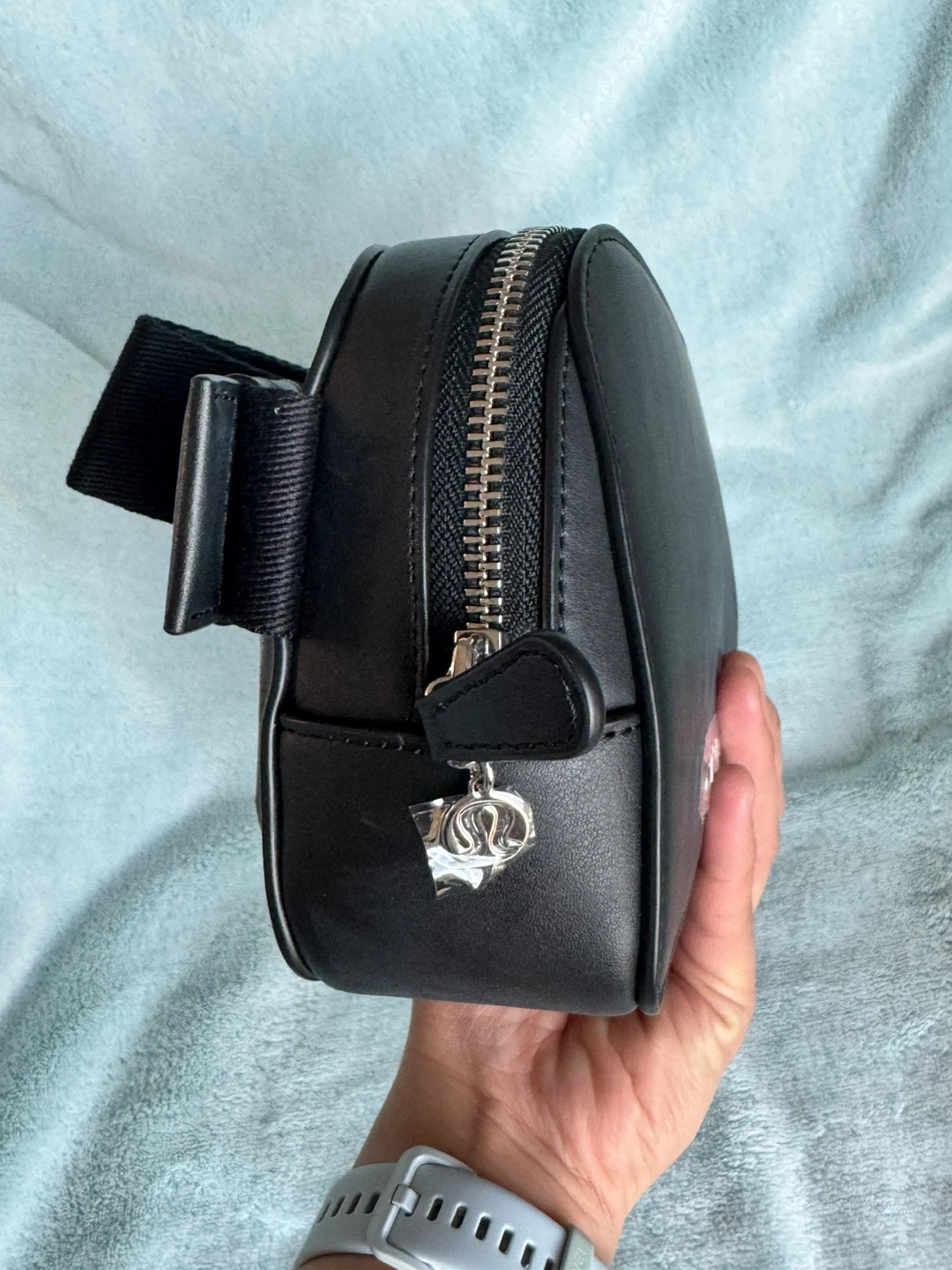 Lululemon Everywhere Belt Bag in black faux leather. It has a zippered main compartment and an adjustable strap. Includes dust bag.