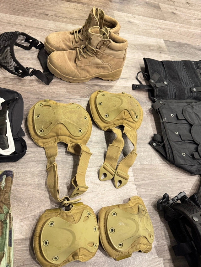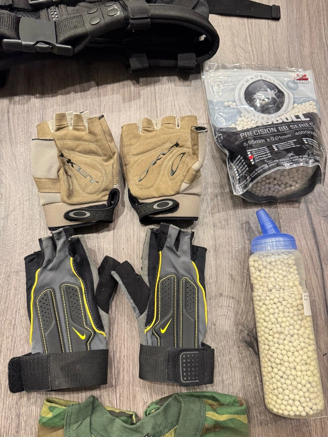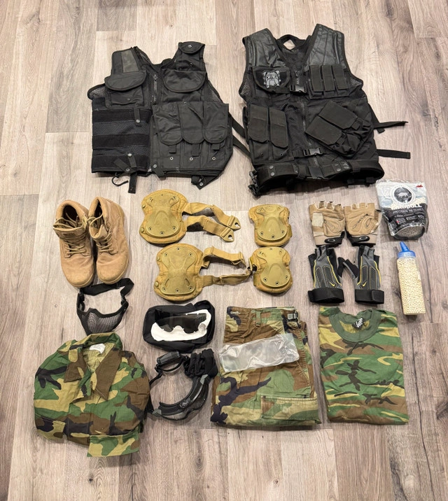 5Selling a complete used war game wear set, perfect for airsoft or paintball enthusiasts. The set includes tactical vests, camouflage uniform, protective goggles, gloves, knee and elbow pads, combat boots, and a bag of BB pellets. All items are in good condition with normal signs of use. Ideal for players seeking reliable, ready-to-use gear for outdoor tactical games. Comfortable, durable, and designed for both safety and performance on the field. Pickup at Kennedy Rd and 16th Ave. For Sale By: Owner
