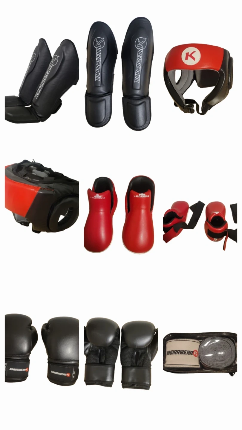 This set includes black shin guards and boxing gloves, red foot guards, and a red/black head guard. The gloves are 12 oz. Also included are hand wraps in a clear pouch.