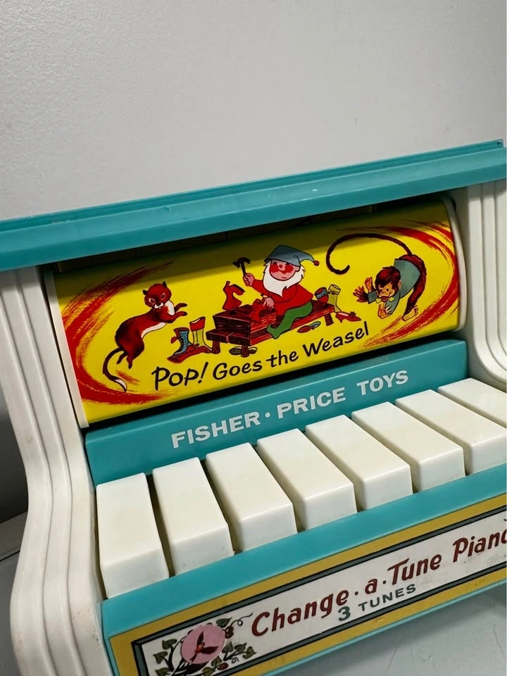Classic Fisher Price Change-a-Tune Piano. This vintage toy has 3 tunes. Front has the 'Pop! Goes the Weasel' design. Side features a colorful bird and tree graphic. All keys present and clean. Excellent condition. Beautiful melody! Pickup only in COQUITLAM, Westwood Plateau, behind IGA.